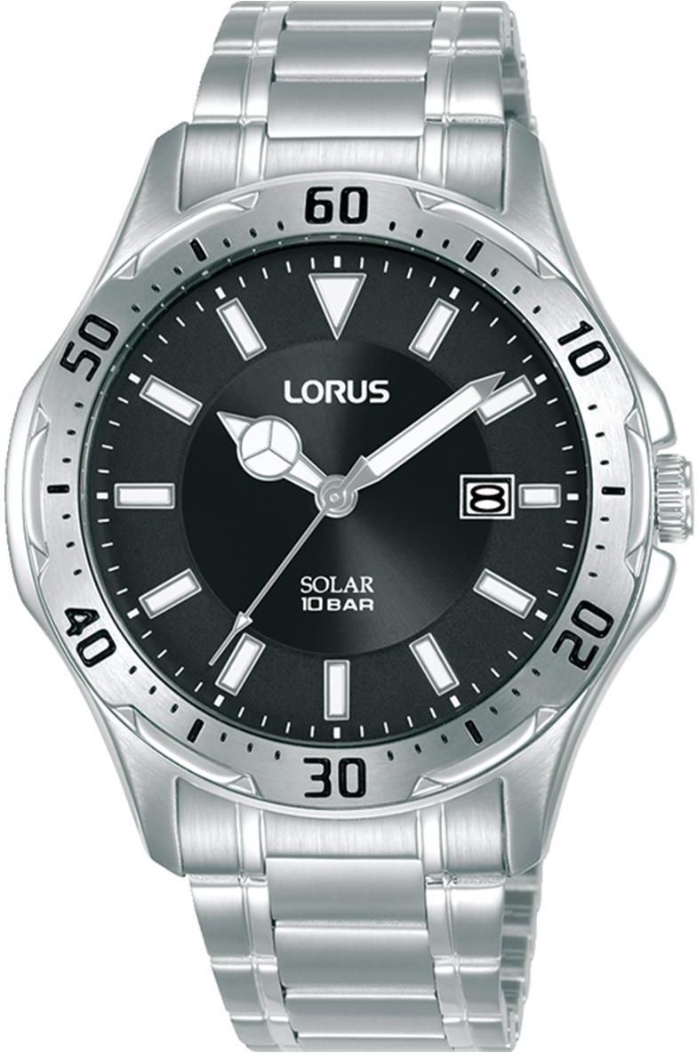 Męski sportowy czytelny wodoszczelny zegarek Lorus RX395AX9 - stalowa koperta i bransoleta w kolorze srebrnym, czarna tarcza czasomierza, datownik, neobrite, zakręcany dekielek, klasa szczelności 100M, mechanizm zasilany energią słoneczną - solar