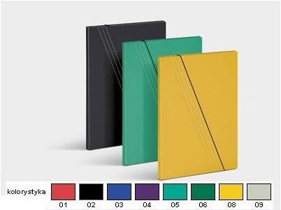 Teczka z gumką VauPe, wykonana z tektury jednostronnie barwionej powlekanej polipropylenem. Dodatkowym elementem ozdobnym są ukośne bigi z nałożoną równolegle gumką. Teczka dostępna jest do formatu A4 i o szerokości 10 mm