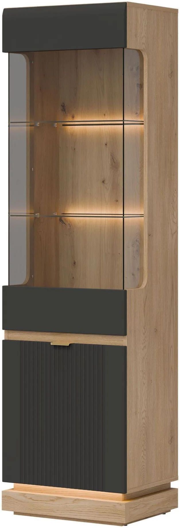 Witryna wąska Przeszklona szafka do salonu Dąb Cremona Antracyt MILTON ML05 MILTON ML05 Wysoka witryna L/P ML05 pochodząca z kolekcji Milton stworzona z myślą o Minimalistycznyj aranżacji jadalni, kuchni, salonu czy pokoju dziennego, która zachwyci wyjątkowym stylem, funkcjonalnością i wygodą …
