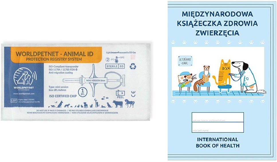 ZESTAW strzykawka z mikroczipem RF-IDW-2 900... + KSIĄŻECZKA ZDROWIA Aby możliwa była identyfikacja zwierzęcia, konieczna jest rejestracja numeru mikroczipa w Centralnej Bazie Danych Zwierząt Oznakowanych Elektronicznie. REJESTRUJĄC ZWIERZĘ W bazie CBDZOE, URUCHAMIASZ PROCEDURĘ REJESTRACJI NUMERU MIKROCZIPA W ŚWIATOWEJ BAZIE DANYCH WORLDPETNET --- www.worldpetnet.com Numer początkowy: 900... Specyfikacja techniczna zestawu RF-IDW-2 jednorazowy aplikator - strzykawka z mikroczipem; zestaw zawiera 6 naklejek z numerem czipa i kodem kreskowym; spełniający wszystkie normy ISO; certyfikowany przez Międzynarodowy Komitet ds. Rejestracji Zwierząt ICAR z siedzibą w Rzymie. Transponder standard czipa: ISO 11784/11785 FDX-B; typ czipa: HitagS-256/EM4305, 134,2KHz; wymiary: długość 8mm, szerokość 1.4mm ± 0,1mm; rodzaj sterylizacji: tlenek etylenu; klasa szczelności: IP67; temperatura przechowywania -30°C do +85°C; gwarancja: dożywotnia. Cechy zestawu RF-IDW-2 zapewnia bezpieczeństwo w programach identyfikacji i ewidencji zwierząt; bardzo dobra trwałość i jakość wykonania; igła wykonana z najwyższej jakości stali chirurgicznej; zastosowano technologie Parylene C w celu zabezpieczenia mikroczipa; zastosowano szkło biokompatybilne w celu ochrony organizmu zwierzęcia; system Anti Drop System – zapobiega wypadaniu transpondera aż do momentu jego implementacji; 100% niezawodności; zgodny z wszystkimi normami ICAR ISO standard 24631-Part 1 "ISO 11784/11785, ISO standard 24631-3 (Radiofrequency identification of animals Evaluation of performance of RFID transponders conforming with ISO 11784 and ISO 11785 ; odległość odczytu zróżnicowana od rodzaju czytnika. ZAPRASZAMY DO ZAKUPU!!! Zamówienia złożone do godziny 13.00 będą wysyłane jeszcze tego samego dnia!!!! MIKROCZIP jest kompatybilny (współpracuje) z drzwiczkami (klapą) dla kota SureFlap, PetSafe, Closer Pets, FERPLAST i innymi które wyposażone są w czytnik mikrochipów (standard FDX-B).