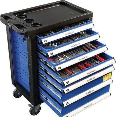 Wysokiej jakości wózek narzędziowy. Metalowe ścianki wzmocniono narożnikami z tworzywa. Wózek wyposażony w 7 pojemnych szuflad na masywnych prowadnicach. Wbudowany zamek na kluczyk, blokujący wszystkie szuflady. Duże koła z hamulcem. W czterech szufladach znajduje się łącznie 217 elementów wyposażenia. Całe wyposażenie zostało wykonane ze wzmocnionego stopu stali narzędziowej Cr-V (Chromowo - wanadowej) Trzy dolne szuflady pozostają do Państwa dyspozycji. Wózek posiada gumowane rączki. Duży blat roboczy z trzema kieszonkami i sześcioma otworami na śrubokręty. Dokładny opis zawartości szuflad Szuflada 1 Zestaw 47 szt. kluczy nasadowych z chwytem 1/4”: Nasadki: 4; 4,5; 5; 5,5 ; 6; 7; 8; 9; 10; 11; 12; 13; 14 mm Przegub uniwersalny, pokrętło poprzeczne Przedłużki: 50 mm oraz 100 mm Pokrętło zapadkowe oraz rękojeść wkrętakową Złączka na bit sześciokątny duży Torx długi: T20, T25, T30, T40, T45, T50 Torx krótki z dziurką: T20, T25, T30, T40, T45, T50, T55 Torx krótki: T8, T9, T10, T15, T20, T25, T27, T30, T40 Zestaw nasadek Torx wewnętrzny: E4, E5, E6, E7, E8 Zestaw 31 szt. kluczy nasadowych z chwytem 3/8”: Nasadki sześciokątne: 6, 7, 8, 9, 10, 11, 12, 13, 14, 15, 16, 17, 18, 19, 20, 21, 22 mm Nasadki do świec: 16 i 21 mm Zestaw nasadek Torx wewnętrznych: E10, E11, E12, E14, E16, E18, E20 Przegub uniwersalny Pokrętło poprzeczne Przedłużki: 75 mm oraz 150 mm Pokrętło zapadkowe Zestaw 27 szt. kluczy nasadowych z chwytem 1/2”: Nasadki sześciokątne: 8, 10, 11, 12, 13, 14, 15, 16, 17, 18, 19, 20, 21, 22, 23, 24, 26, 27, 28, 30, 32 mm Złączka na bit sześciokątny duży Przegub uniwersalny Pokrętło poprzeczne Przedłużki 125 mm i 250 mm Pokrętło zapadkowe Szuflada 2 Zestaw 17 szt. kluczy płasko-oczkowych o wymiarach od 6 mm do 22 mm Zestaw 8 szt. kluczy oczkowych giętych: 6x7, 8x9, 10x11, 12x13, 14x15, 16x17, 18x19, 20x22 mm Zestaw 10 szt. kluczy płaskich dwustronnych: 6x7, 8x9, 10x11, 12x13, 14x15, 16x17, 18x19, 20x22, 24x27, 30x32 mm Szuflada 3 Zestaw 8 wkrętaków: płaskie : 6x38, 5x100, 4x100, 6x150 mm krzyżowe : 6x38, 5x100, 6x100, 6x150 mm Zestaw 13 kluczy imbusowych typu Torx: T8, T10, T15, T20, T25, T27, T30, T40, T45, T50, T55, T60, T70 Zestaw 42 elementów składających się z: 10 szt. kluczy trzpieniowych kątowych z kulką - długich: 1,5 ; 2; 2,5; 3 ; 4 ; 5; 5,5; 6; 8; 10 mm nasadek 1/4” długa 5, 6, 7, 8, 9, 10, 11, 12, 13 mm nasadek1/2” Torx: T50, T60, T70 końcówek wkrętakowych płaskich 4; 5,5; 7 końcówek wkrętakowych krzyżowych PH 1, PH 2 , PH 3, PZ 1, PZ 2, PZ 3 końcówek typu Torx T8, T10, T15, T20 , T25, T27, T30, T40 końcówek imbusowych sześciokątnych: 3, 4, 5, 6, 7,8 mm Szuflada 4 Młotek warsztatowy 300g z trzonkiem z włókna szklanego Pobijak plastikowy z trzonkiem z włókna szklanego Zestaw przecinaków: 16, 18, 24 mm Zestaw szczypiec: Szczypce płaskie 175 mm, Szczypce z cięciem bocznym 175 mm Kombinerki 200 mm Szczypce uniwersalne 250 mm Szczypce nastawne 250 mm