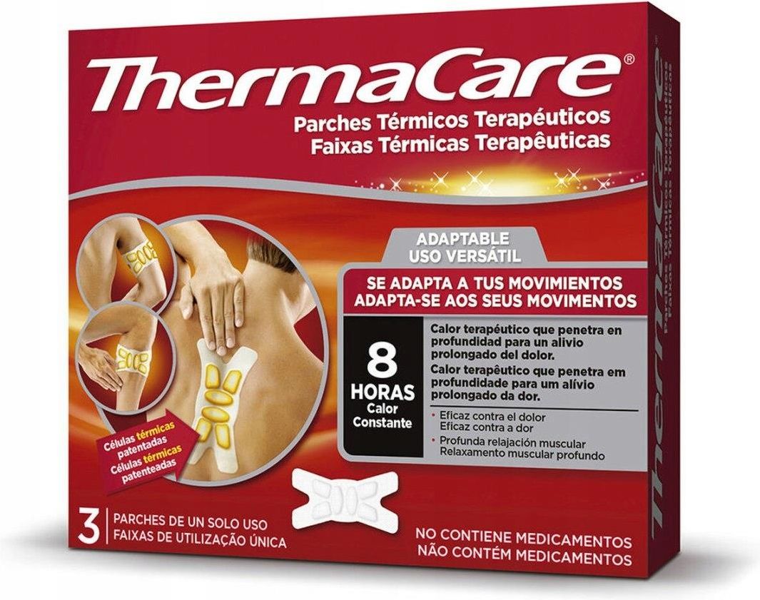 PLASTRY CAŁKOWICIE NOWE - WYSYŁANE W WORECZKU FOLIOWYM - POCHODZĄ Z WIĘKSZEGO OPAKOWANIA ZBIORCZEGO THERMACARE PLASTRY ROZGRZEWAJĄCE 3 szt. Thermacare przeciwbólowe plastry rozgrzewające to produkt przeznaczony do stosowania w przypadku rozległych bólów mięśni i stawów. Polecany zwłaszcza w przypadku występowania bólu punktowego. Warto sięgnąć po ten produkt w przypadku zauważenia występowania problemów z poruszaniem się w związku z odczuwanymi dolegliwościami bólowymi. Do częstych przyczyn pojawiania się wspomnianych rodzajów bólu należą: napięcie, nadmierny wysiłek, naciągnięcie mięśni czy też artroza, czyli chroniczne zapalenie stawów. Produkt może być stosowany zarówno w przypadku bólu występującego sporadycznie jak i przy dolegliwościach przewlekłych. Polecany sportowcom, którzy w szczególny sposób narażeni są na różnego rodzaju kontuzje powodujące ból mięsni i stawów. Kompresy samorozgrzewające ThermaCare dostarczają stałe ciepło lecznicze ( 40°C ), które przenika głęboko do mięśni i zwalcza źródło bólu. Zwiększone krążenie krwi pomaga złagodzić ból i rozluźnia obolałe mięśnie. Kompresy ThermaCare nie zawierają żadnej substancji czynnej, aktywują się pod wpływem powietrza, dzięki czemu samoczynnie zaczynają się rozgrzewać.Poduszki są cienkie, wygodne i dyskretne, podążają za każdym ruchem i zapewniają duży komfort użycia. zapewniają skuteczną i długotrwałą ulgę w bólu zwalczają źródło bólu nie zawierają substancji czynnych generują stałe ciepło lecznicze przez okres 8 godzin, a kojące ciepło może być odczuwalne do kolejnych 8 godzin mogą być dyskretnie noszone pod ubraniem, nie generują przykrego zapachu Sposób użycia Aby rozpocząć terapię termalną (zwaną inaczej terapią stałym ciepłem) z zastosowaniem leczniczego kompresu ThermaCare należy postępować zgodnie z przedstawionymi krokami: Otwórz folię ochronną bezpośrednio przed użyciem. Czas jaki pas ThermaCare potrzebuje aby osiągnąć temperaturę terapeutyczną może wynosić do 30 minut. Umieść kompres ThermaCare w bolącym miejscu w ten sposób, aby ciemniejsze dyski znajdowały się na skórze. Ryzyko oparzeń skóry rośnie wraz z wiekiem, osoby w wieku 55 lat lub starsze powinny rozważyć założenie pasa ThermaCare na warstwę ubrania, tak by kompres nie przylegał bezpośrednio do powierzchni skóry. Kompres należy mocno przytwierdzić. Aby osiągnąć maksymalną skuteczność zaleca się noszenie leczniczego pasa ThermaCare przez około 8 godzin. !!! nie należy stosować dłużej niż 8 godzin w ciągu doby produkt importowany z Hiszpanii wszystkie opakowania posiadają szatę graficzną oraz opis w języku Hiszpańskim! Skład proszek żelaza, sól, węgiel aktywny, wodę. A14