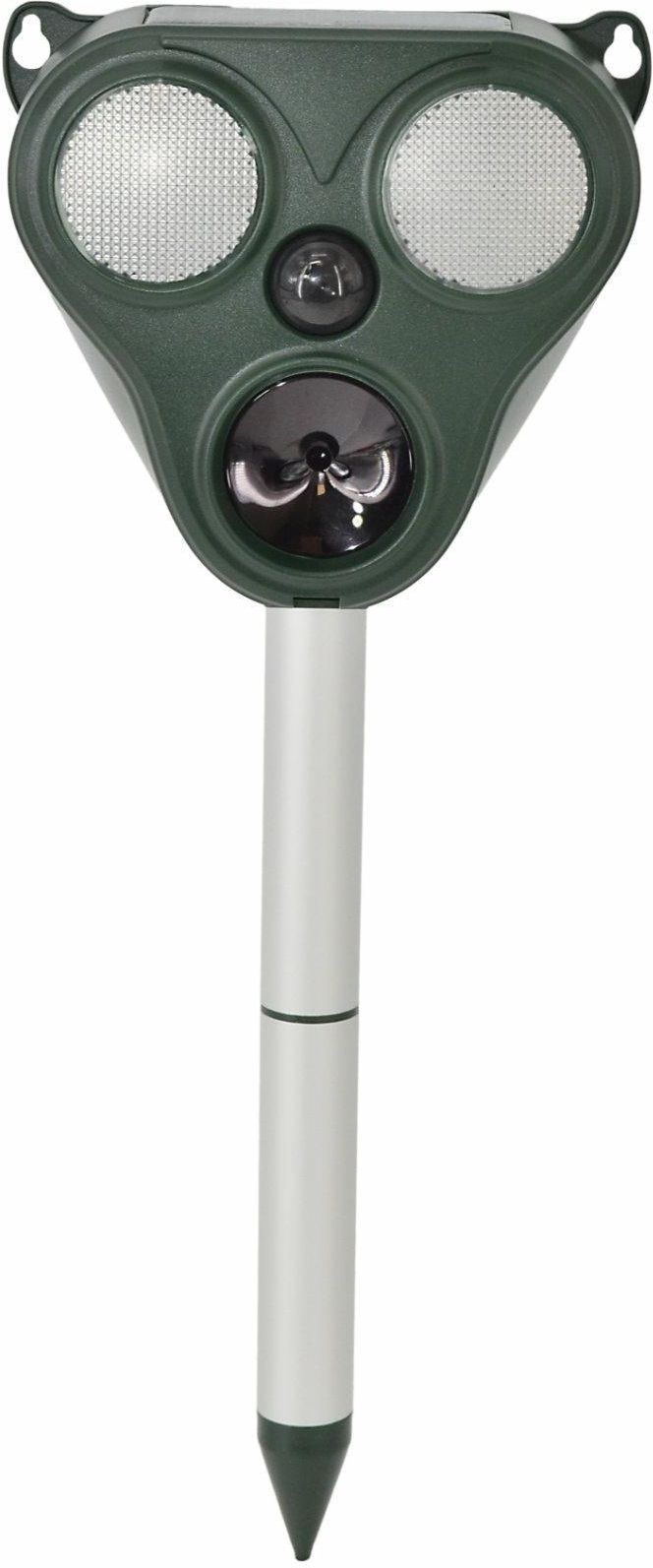 Wyposażony w głośnik ultradźwiękowy, który emituje dźwięki o wysokiej częstotliwości, alarm dźwiękowy, inteligentny czujnik ruchu PIR, oraz migające diody LED. Posiada panel solarny umieszczony na górze, który ładuje się za pomocą energii słonecznej lub portu USB. Trwała obudowa ABS zapewnia odporność na uszkodzenia mechaniczne oraz sprawdzi się w każdych warunkach pogodowych. Dołączony kolec do wbijania w ziemię oraz uchwyt montażowy umożliwiają łatwą i szybką instalację. Skuteczny w odstraszaniu kotów, psów, szczurów, myszy, wiewiórek, królików, kun, fretek i ptaków, a także innych dzikich zwierząt ogrodowych. Nie zagraża życiu i zdrowiu zwierząt czy ludzi, a także nie wpływa negatywnie na środowisko. Dane techniczne: Zasilanie: panel solarny, akumulator 3*AA,1.2V,800 mAh, Ni-MH Zasięg wykrywania: 5-10m/ kąt reakcji: 110° Zasięg działania: 300m2 Częstotliwość ultradźwiękowa: 13-65.5 kHz (5 trybów pracy) Stopień ochrony: IP66 Wymiary: 147*366*50mm Waga: 400g