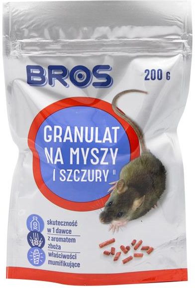 BROS GRANULAT NA MYSZY I SZCZURY - TRUTKA 200G TRUTKA NA MYSZY I SZCZURY W FORMIE GRANULATU O WŁAŚCIWOŚCIACH MUMIFIKUJĄCYCH DO STOSOWANIA WEWNĄTRZ I WOKÓŁ BUDYNKÓW Granulat do zwalczania myszy i szczurów wewnątrz i wokół budynków. Wykazuje skuteczność już po jednokrotnym spożyciu. Trutka zawiera silnie wabiącą przynętę, jest bardzo atrakcyjna dla gryzoni dzięki aromatowi zboża, a jednocześnie zawiera gorzką substancję bitrex, która zapobiega przypadkowemu spożyciu przez zwierzęta domowe i ludzi. Granulki tej trutki zawierają tylko substancje pokarmowe bez stosowanych w podobnych trutkach wypełniaczy. Opóźnione działanie, po 4-5 dniach od podania, powoduje że gryzonie nie kojarzą trutki ze śmiercią innych osobników. Trutka posiada właściwości mumifikujące. Substancja czynna bromadiolon Dawkowanie - jak stosować Granulat na myszy i szczury Bros? MYSZ DOMOWA - stosować 60 g co 5-10 metrów kwadratowych SZCZUR WĘDROWNY- stosować 100 g co 5-10 metrów kwadratowych. Gdzie można stosować trutkę na myszy i szczury Bros? W pomieszczeniach użyteczności publicznej, w magazynach, w garażach, w kurnikach, chlewach i innych budynkach inwentarskich, itp. Zalety Granulatu na myszy i szczury Bros - jak działa trutka? Możliwość stosowania wewnątrz budynków i na zewnątrz, skuteczność już po jednokrotnym spożyciu, opóźnione działanie, właściwości mumifikujące, atrakcyjny dla gryzoni aromat zboża, substancja zniechęcająca do przypadkowego spożycia przez zwierzęta domowe i ludzi. Zalecenia stosowania Wykładać w miejscach występowania gryzoni: w pobliżu nor, miejsc żerowania na ścieżkach przebiegu. ​Zaleca się co 2-3 dni w przypadku myszy i co 5-7 dni w przypadku szczurów prowadzenie regularnych inspekcji miejsc, gdzie wyłożono trutkę i uzupełniać zjedzoną przynętę oraz wymieniać przynętę uszkodzoną, np. przez wodę. Produktów biobójczych należy używać z zachowaniem środków ostrożności. Przed każdym użyciem należy przeczytać etykietę i informacje dotyczące produktu.