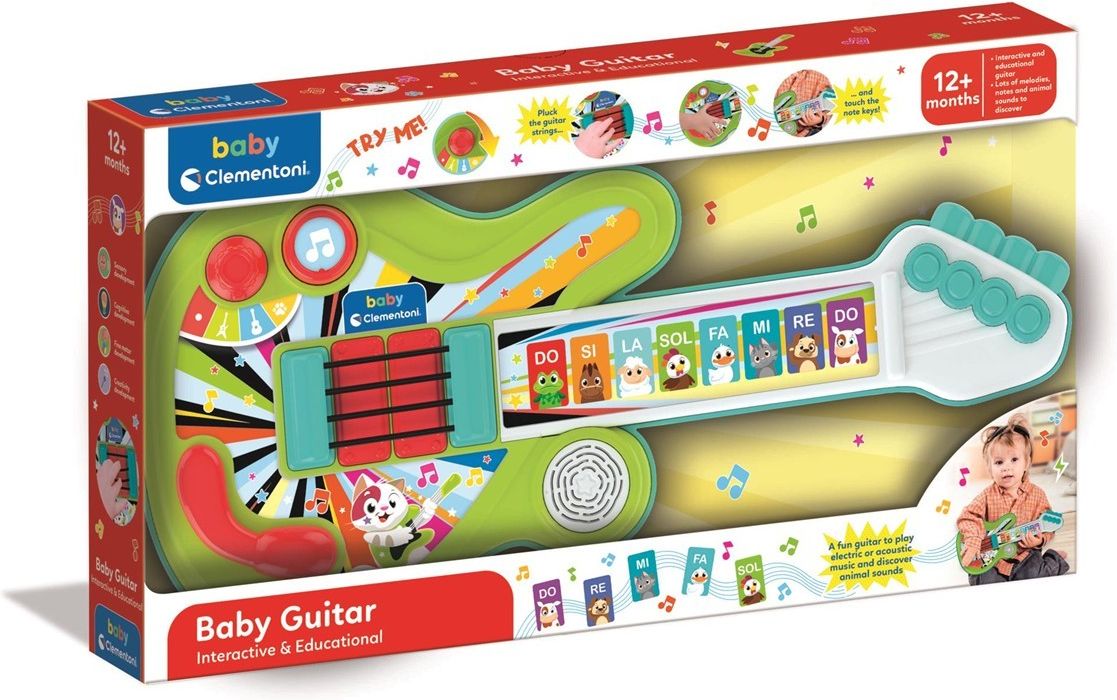 Interaktywna gitara do odkrywania nut i zwierząt dzięki dwóm trybom zabawy. Pomaga rozwijać zdolności poznawcze, sprawność manualną, koordynację i relację przyczyna-skutek. 12 podkładów muzycznych do gry, 12 akordów, 8 nut i 8 zwierzątek do odkrycia poprzez ich dźwięki. Wiek:12m+