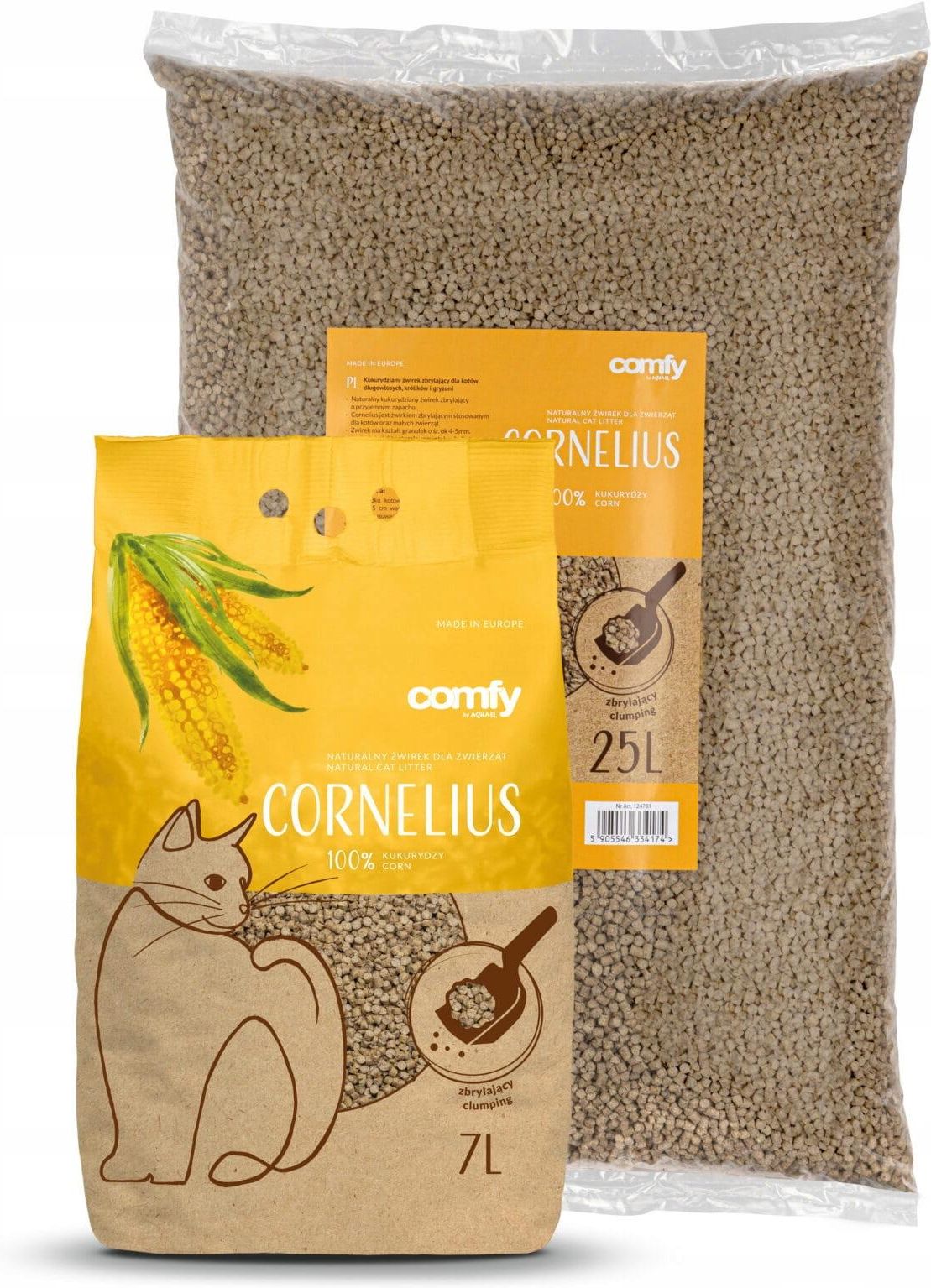 Comfy Żwirek Kukurydziany Cornelius Petit Natural 25l ekologiczny - w 100% wykonany z kukurydzy doskonały do kuwety, terrarium lub woliery nie alergizuje i nie pyli mocno chłonie ciecz - potrafi związać dużą ilość płynów neutralizuje nieprzyjemne zapachy delikatny dla wrażliwych łapek …