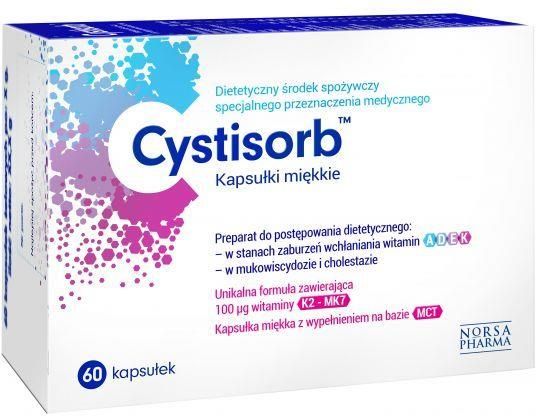 Cystisorb żywność specjalnego przeznaczenia medycznego dla osób dorosłych i dzieci powyżej 3. roku życia. Przyjmowanie Produkt zalecany do stosowania pod nadzorem lekarza. Produkt jest przeznaczony dla osób dorosłych oraz dzieci powyżej 3. roku życia. Zalecana dzienna porcja : 1 kapsułka dziennie w czasie posiłku lub zgodnie z indywidualnymi zaleceniami lekarza. Kapsułkę należy połknąć i popić niewielką ilością wody. Nie przekraczać porcji zalecanej do spożycia w ciągu dnia. Preparat nie może być stosowany jako substytut zróżnicowanej diety. Zrównoważona dieta oraz zdrowy tryb życia to podstawa prawidłowego funkcjonowania organizmu. Ważne informacje Stosowanie produktu przez pacjentów w stanach zaburzeń wchłaniania witamina: A, D, E i K w mukowiscydozie i cholestazie pozwala na dostarczenie składników odżywczych w ilościach nieosiągalnych jedynie przez zmianę normalnej diety. Produkt przyjmowany pod nadzorem lekarza. Ostrzeżenia Nie należy stosować w przypadku nadwrażliwości lub alergii na którykolwiek ze składników preparatu. Witamina K może zaburzać działanie leków przeciwzakrzepowych. Produkt nie może być stosowany jako jedyne źródło pożywienia. Stosowanie przez osoby, u których nie zdiagnozowano zespołu zaburzeń wchłaniania witamin A, D, E K stwarza ryzyko hiperwitaminozy. W trakcie stosowania produktu zalecana jest regularna kontrola (co 3 miesiące) poziomu zawartości witaminy A i D we krwi. Przechowywanie Przechowywać w szczelnie zamkniętym opakowaniu w temperaturze poniżej 25°C, w sposób niewidoczny i niedostępny dla małych dzieci. Chronić przed światłem i wilgocią. Składniki Witamina E (D-alfa-tokoferol), Żelatyna, Witamina K (Menachinon), Średniołańcuchowe trójglicerydy (MCT), substancja utrzymująca wilgoć - Glicerol, przeciwutleniacz - Mieszanina tokoferoli, Cynk (Glukonian cynku), Witamina A (Beta-karoten), Witamina C (L-askorbinian sodu), Selen (Drożdże wzbogacone w selen), substancja przeciwzbrylająca - Dwutlenek krzemu, emulgator - Lecytyna (z soi), Niacyna (Nikotynamid), Witamina D (cholekalcyferol), Koenzym Q10, Kwas pantotenowy (D-pantotenian wapnia), barwniki - Tlenki i wodorotlenki żelaza, Witamina B12 (Cyjanokobolamina), Witamina A (Palmitynian retinylu), Aromat waniliowy, Witamina B6 (Chlorowodorek pirydoksyny), Witamina B1 (Chlorowodorek tiaminy), Witamina B2 (Ryboflawina), Witamina K (Filochinon), Kwas foliowy (Kwas pteroilomonoglutaminowy), Biotyna (D-biotyna). Wartość odżywcza100 g1 kapsułkaWartość energetyczna2695 kJ/ 642 kcal21 kJ/ 5 kcalTłuszcz, w tym:60 g0,46 g- kwasy nasycone54 g0,42 gWęglowodany, w tym:12 g0,09 g- cukry0 g0 gBłonnik0 g0 gBiałko19 g0,15 gSól/Sód1,00 g/ 0,40 g0,01 g/ 0,00 gWitamina A196766,2 µg1515,1 µgWitamina D9740,3 µg75 µgWitamina E13077,9 mg100,7 mgWitamina K77922,0 µg600 µgWitamina C3116,9 mg24 mgTiamina42,9 mg0,33 mgRyboflawina54,5 mg0,42 mgNiacyna623,4 mg4,8 mgWitamina B654,5 mg0,42 mgKwas foliowy7792,2 µg60 µgWitamina B1297,4 µg0,75 µgBiotyna1948,1 µg15 µgKwas pantotenowy233,8 mg1,8 mgCynk649,4 mg5 mgSelen2922,1 µg22,5 µgKoenzym Q10389,6 mg3 mg Informacje dodatkowe: Witamina A 5000 IU (1515,1 µg), w tym: Beta karoten: 4000 IU (1212,1 µg) Plamitynian retinylu: 1000 IU (303 µg) Witamina D3: 3000 IU (75 µg) Witamina E: 150 IU (100,7 mg) Witamina K: 600 µg, w tym: Witamina K1: 500 µg, Witamina K2 MK-7: 100 µg) Masa netto 46,2 g Producent Wyprodukowano dla: Norsa Pharma Sp. z o.o. ul. Prof. M. Życzkowskiego 14 31-864 Kraków