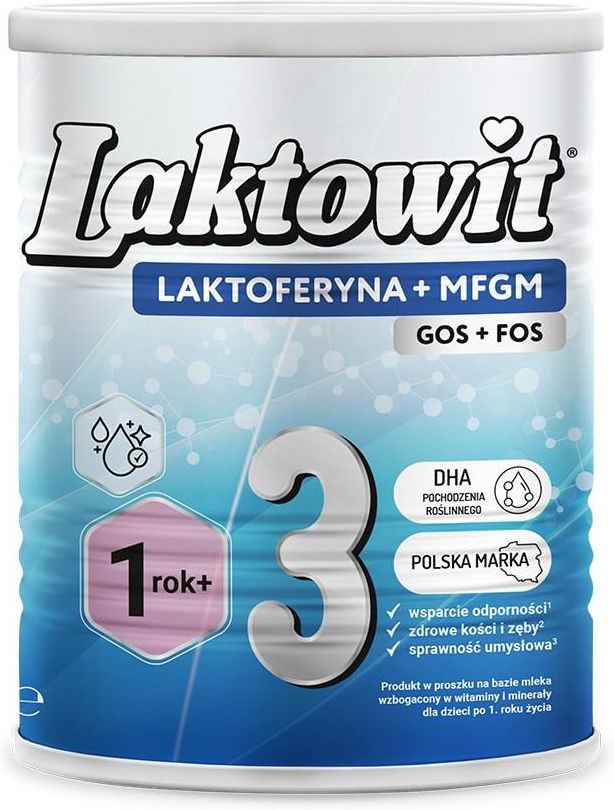 Laktowit Premium LAKTOFERYNA+MFGM 3 mleko modifykowane po 1. roku życia Mleko z największą zawartością laktoferyny na rynku Sięgnij po mleko, które ma polskie pochodzenie, polską tradycję, a jednocześnie fantastyczne zaplecze naukowe i doświadczenie w żywieniu noworodków i niemowląt. Do tego mleko modyfikowane Laktowit Premium Laktoferyna+MFGM jest najnowocześniejszą dostępną formułą opartą na składzie mleka kobiecego. Z każdą kolejną recepturą staramy się zbliżyć choć o krok do doskonałego pod każdym względem naturalnego pokarmu. Laktowit Premium Laktoferyna+MFGM 3 to unikalne mleko modyfikowane na polskim rynku. SKŁAD OPRACOWANY NA PODSTAWIE BADAŃBadania kliniczne na niemowlętach wykazały, że dodatek laktoferyny i MFGM do mleka dla niemowląt powoduje korzystny wpływ na rozwój neurologiczny w wieku 12 miesięcy. Badania wykazały również, że na przyspieszony rozwój neurologiczny przekładały się polepszone zdolności poznawcze, językowe i motoryczne oraz wzrost zdolności koncentracji. U niemowląt karmionych mlekiem wzbogaconym w MFGM i laktoferynę zauważono również przyspieszony rozwój zdolności komunikacyjnych (w niektórych domenach językowych) w wieku 18 miesięcy. To samo badanie kliniczne wykazało jeszcze jedną bardzo ważną rzecz: dodanie laktoferyny i MFGM do mleka modyfikowanego nie tylko wpływa pozytywnie na rozwój niemowląt i dzieci ale jest w pełni bezpieczne. Może również może wpływać na stan zdrowia: dzieci rzadziej doświadczały biegunek oraz rzadziej doświadczały działań niepożądanych ze strony układu oddechowego. DZIAŁANIE LAKTOFERYNY I MFGMLaktoferyna w mleku matki pełni wiele funkcji biologicznych. Posiada wyjątkowe właściwości immunomodulacyjne (modyfikuje układ odpornościowy wzmacniając ochronę i obronę organizmu przed szkodliwymi bakteriami, wirusami, grzybami i organizmami jednokomórkowymi). Laktoferyna jest obecna naturalnie w każdym organizmie człowieka – jej główne zadania to transport żelaza. To tej właściwości zawdzięcza podstawowy mechanizm zwalczania chorobotwórczych bakterii - zapobiega wykorzystywaniu żelaza przez drobnoustroje. Do tego zakłóca funkcjonowanie błon komórkowych bakterii, zapobiega bezpośredniemu wnikaniu bakterii i wirusów. W organizmie gospodarza wpływa na intensywność i szybkość odpowiedzi odpornościowej; „woła” w odpowiednie miejsce białe krwinki wyspecjalizowane w zwalczaniu patogenów i wywołuje w nich reakcje, by jak najszybciej ten zły organizm zneutralizować. Kuleczki MFGM (z ang. milk fat globule membranę) składają się z triglicerydów, sfingolipidów i fosfolipidów, cholesterolu, cerebrozydów, glikoprotein oraz gangliozydów. Większość z tych związków jest zaangażowana w rozwój mieliny i samego układu nerwowego – biorą udział we wzroście, migracji i dojrzewaniu neuronów, w tworzeniu się synaps oraz neurytów a także w procesie mielinizacji. Poprawiają tym samym rozwój układu nerwowego i wpływają na szybkość rozwoju zdolności poznawczych. Glikoproteiny działają w jelitach, wpływając tam korzystnie na mikrobiotę jelitową. ŚWIETNY SKŁADDo produkcji mleka Laktowit używamy tylko najwyższej jakości surowców, od sprawdzonych dostawców. Każda partia mleka Laktowit Premium Laktoferyna+MFGM, zanim trafi do sklepów, przechodzi rygorystyczne badania laboratoryjne. Ponadto mleko Laktowit Premium Laktoferyna+MFGM wyróżniają następujące cechy: Nie zawiera oleju palmowego. Zawiera zestaw prebiotyków GOS + FOS, naśladujący oligosacharydy występujące naturalnie w mleku matki. Zawiera długołańcuchowe wielonienasycone kwasy tłuszczowe (LCP) DHA (zgodnie z wymogiem prawnym dotyczącym wszystkich preparatów do początkowego i następnego żywienia niemowląt) Zawiera nukleotydy. Posiada delikatny, mleczny smak Zawiera odpowiednią ilość składników odżywczych. Zawiera tylko najwyższej jakości łatwostrawne białka. Pakowane jest w puszki stalowe najwyższej jakości, pozostających pod ścisłą kontrolą bezpieczeństwa. Puszki podlegają recyklingowi Najwyższa jakość potwierdzona badaniami laboratoryjnymi Proces produkcji jest certyfikowany przez zewnętrznych audytorów, za zakład produkcyjny jest pod stałym nadzorem polskich władz sanitarnych oraz weterynaryjnych. Używane do produkcji mleko jest przetwarzane lokalnie i w minimalnym stopniu. Produkowane jest tylko z pochodzących z Polski oraz Unii Europejskiej składników. Laktowit to polska marka i polski producent – wspieraj lokalne marki BEZPIECZEŃSTWO I ROZWÓJ DZIECKAPodsumowując, naukowcy dowiedli, że dodawanie do mleka modyfikowanego zarówno MFGM oraz laktoferyny jest: W pełni bezpieczne dla niemowląt już od pierwszego dnia życia Wpływa na rozwój układu nerwowego, zdolności poznawcze, rozwój psychomotoryczny, zwiększa koordynację, poprawia zdolności komunikacji Poprawia stan mikrobioty jelitowej, dzięki temu wpływa na odporność oraz zapobiega infekcjom przewodu pokarmowego oraz występowaniu biegunek Poprawia odporność, zmniejsza liczbę występujących infekcji dróg oddechowych, ucha, działa przeciw wirusowo, przeciwbakteryjnie, przeciw grzybiczo oraz przeciw pierwotniakom, zmniejsza stan zapalny Opracowanie mleka modyfikowanego z dodatkiem zarówno MFGM oraz laktoferyny znacząco zmniejsza różnicę w umiejętnościach psychomotorycznych i zdolnościach poznawczych między dziećmi żywionymi sztucznie, a tymi karmionymi mlekiem matki. Sprawia również, że dzieci karmione mlekiem modyfikowanym z laktoferyną i MFGM rzadziej zapadają na infekcje niż ich rówieśnicy żywieni mlekiem modyfikowanym bez tych dodatków. MARKA LAKTOWITLaktowit, to najstarsza polska marka mleka dla niemowląt, która zadebiutowała na rynku w latach 70tych XX wieku. Mamy 30 lat doświadczenia w branży mleczarskiej i żywienia niemowląt. Lata zdobywania wiedzy, praktyki i umiejętności o