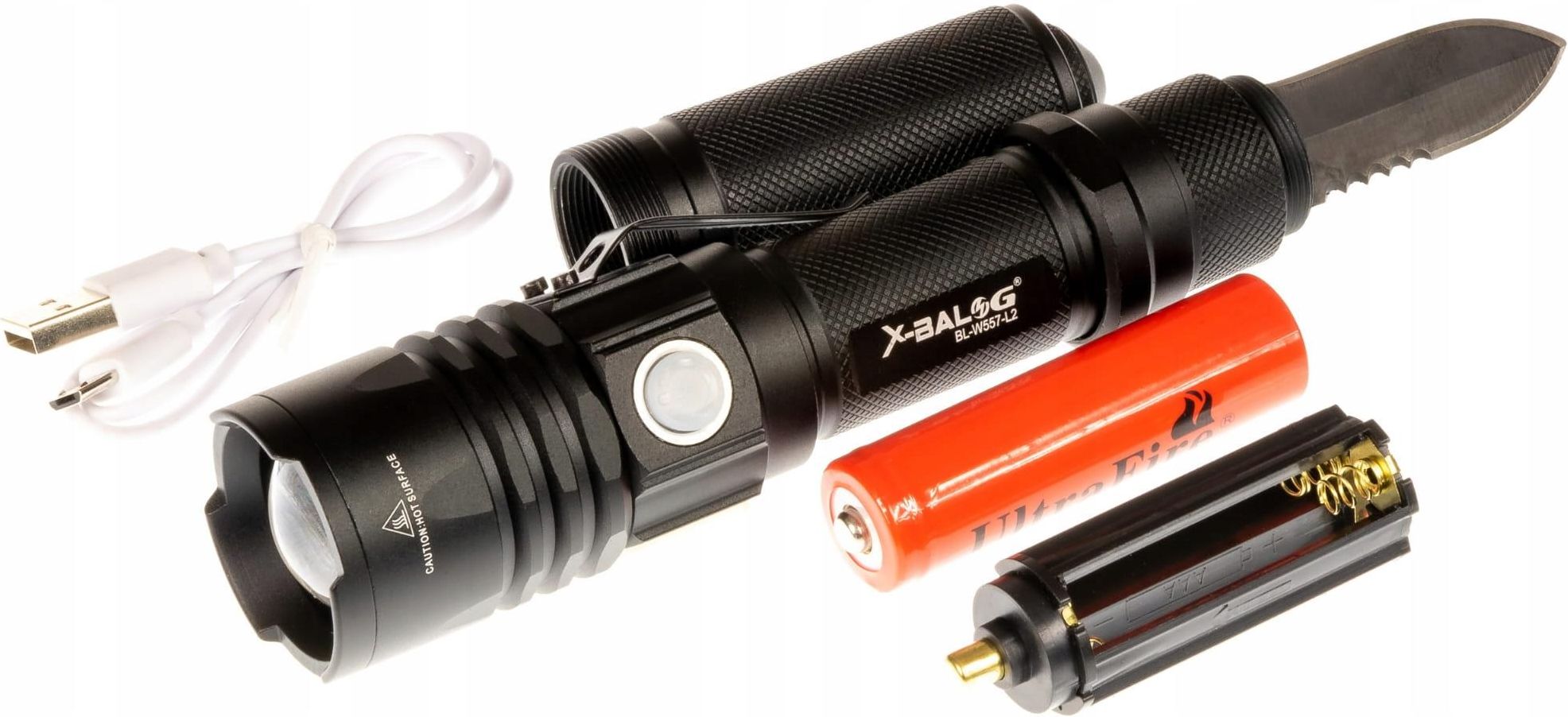 Latarka Turystyczna X-Balog BL-W557-L2 - LT021 Latarka wyposażona jest w bardzo jasną diodę CREE L2. Jest to dioda półprzewodnikowa, która może oślepić każdego. Żywotność diody to 100.000 GODZIN!!! Latarka dodatkowo wyposażona jest w nóż oraz wybijak do szyb. Latarka wyposażona jest w bardzo jasną diodę CREE L2. Jest to dioda półprzewodnikowa, która może oślepić każdego. Żywotność diody to 100.000 GODZIN!!! Latarka dodatkowo wyposażona jest w nóż oraz wybijak do szyb. Latarka posiada obudowę ze stopu aluminium lotniczego, najmocniejszego stopu dostępnego na rynku. Jej powierzchnia ma strukturę antypoślizgową. W zestawie Latarka z nożem Akumulator 18650 3,7 V Koszyczek na baterię 3 x AAA Przewód microUSB do ładowania Wymiary Długość: 220 mm Długość z wyciągniętym zoom: 235 mm Średnica: 25 mm Średnica soczewki: 35 mm Specyfikacja techniczna Zasięg: do 500 m Typ diody: CREE L2 Tryb pracy: 100%, 50%, stroboskop Zoom regulowany: wysuwany Moc światła: 12500 Lumenów Obudowa: lotnicze aluminium Pokrycie: anodyzowana powłoka Waga: 200 g Zasilanie: 1 x akumulator (w zestawie), lub baterię 3 x AAA (brak w zestawie)