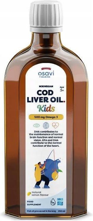Osavi to suplement diety w postaci tranu, przeznaczony dla osób dzieci powyżej 3 roku życia. Preparat zawiera składniki wspierające prawidłowe funkcjonowanie układu odpornościowego, a także przyczynia się do utrzymania prawidłowego funkcjonowania mózgu i prawidłowego widzenia. Składniki: Olej z wątroby dorsza, naturalny aromat cytrynowy, witamina A (palmitynian retinylu), przeciwutleniacz: mieszanina tokoferoli. 2,5 ml zawiera: Olej rybi - 2300 mg**, Kwasy omega-3 - 500 mg**, EPA (kwas eikozapentaenowy) - 200 mg**, DHA (kwas dokozaheksaenowy) - 300 mg**, Witamina A (palmitynian retinylu) - 135 µg (17%)*. *RWS - Referencyjna Wartość Spożycia. **RWS - Nie ustalone. Masa netto: 250 ml Właściwości: Wspiera prawidłowe funkcjonowanie układu odpornościowego. Kwas dokozaheksaenowy (DHA) przyczynia się do utrzymania prawidłowego funkcjonowania mózgu i prawidłowego widzenia. Kwas eikozapentaenowy (EPA) i dokozaheksaenowy (DHA) przyczyniają się do prawidłowego funkcjonowania serca. Witamina A pomaga w utrzymaniu prawidłowego widzenia. Zalecane dzienne spożycie: Przyjmuj 1/2 łyżeczki oleju dziennie. Sugerujemy przyjmować z posiłkiem lub bezpośrednio po posiłku (lub jak zalecił pediatra). Przeciwwskazania: Nie spożywać w przypadku uczulenia na którykolwiek składnik produktu. Przechowywanie: Przechowywać w ciemnym i suchym miejscu w temperaturze pokojowej, w sposób niedostępny dla małych dzieci. Po otwarciu przechowywać w lodówce i zużyć w ciągu 3 miesięcy. Producent: Olivit Sp. z o.o. ul. Blacharska 11, 61-006 Poznań
