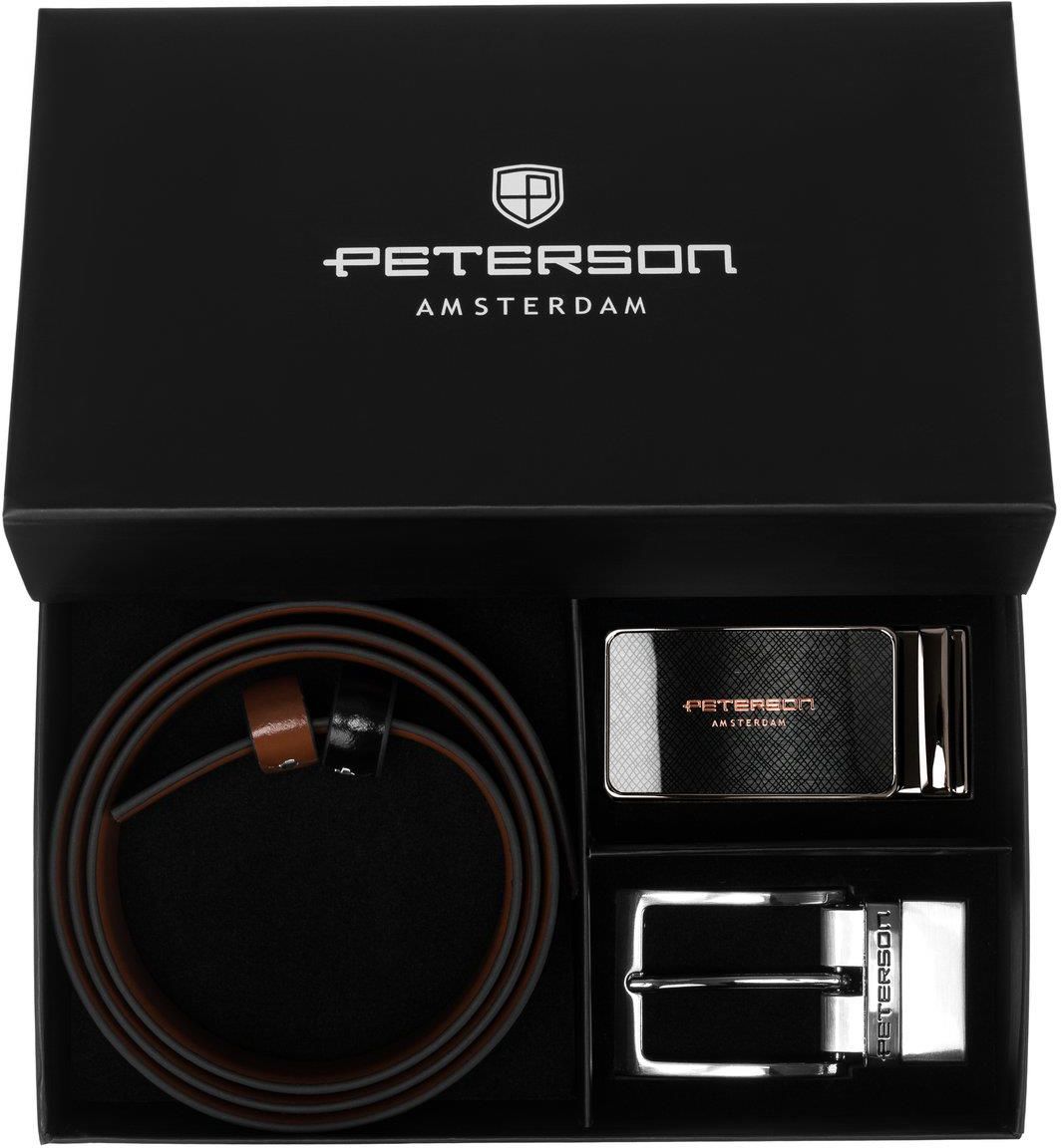 Pasek męski do spodni ze skóry naturalnej dwustronny czarny brązowy zestaw prezentowy dwie wymienne klamry tradycyjna i na bolec PETERSON Reszel