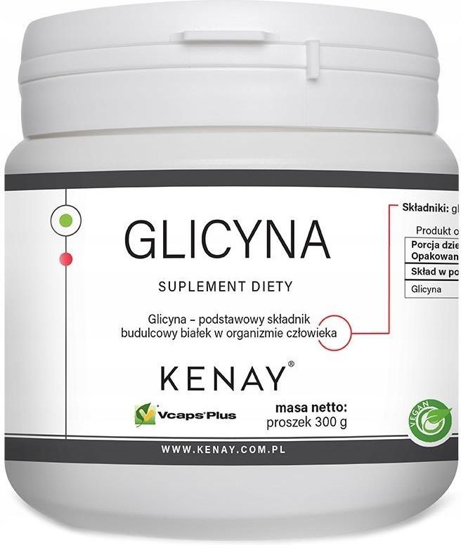 SUPLEMENT DIETY Kenay Glicyna (proszek 300 g) Glicyna to podstawowy składnik budulcowy białek w organizmie człowieka. Glicyna to jedna z 20 podstawowych aminokwasów, które są budulcem białek w organizmach żywych. Jest to najprostszy aminokwas, ponieważ ma najmniejszą masę cząsteczkową spośród wszystkich aminokwasów. Jej struktura chemiczna zawiera tylko jedno atom węgla (C), dwie atomy wodoru (H), jedno ogniwo aminowe (NH2) i jedno ogniwo karboksylowe (COOH). Glicyna to podstawowy składnik budulcowy białek w organizmie człowieka. W mózgu pełni rolę neurotransmitera, który przekazuje sygnały między komórkami nerwowymi. Jest inhibitorycznym neuroprzekaźnikiem, co oznacza, że ​​hamuje aktywność neuronów, zmniejszając pobudzenie nerwowe. Glicyna wchodzi w skład białek i peptydów, które są niezbędne do budowy i naprawy tkanek w organizmie. Korzyści i cechy produktu odpowiedni dla wegan i wegetarian kraj pochodzenia: Japonia clean label - wyłącznie składniki aktywne, bez substancji wiążących, wypełniaczy, substancji poślizgowych i innych dodatków _________________________________________________________ Skład w porcji dziennej (1/2 miarki (2 g)) Glicyna / 2 g _________________________________________________________ Składniki: glicyna. Sposób użycia: 2 g (1/2 miarki) dziennie, wymieszać w 100 - 150 ml wody lub soku. Spożywać jeden raz dziennie, najlepiej 30 min przed posiłkiem. Sposób przechowywania: przechowywać w zamkniętym opakowaniu w temperaturze pokojowej, w sposób niedostępny dla małych dzieci Uwagi: nie należy przekraczać zalecanej porcji do spożycia w ciągu dnia. Suplementy diety nie mogą być stosowane jako substytut (zamiennik) zróżnicowanej diety. Nie należy stosować w przypadku nadwrażliwości na jakikolwiek składnik preparatu. Preparatu nie powinny stosować kobiety w ciąży, karmiące piersią oraz dzieci i młodzież poniżej 18 roku życia. Producent: Kenay Sp. J Opakowanie: 300g