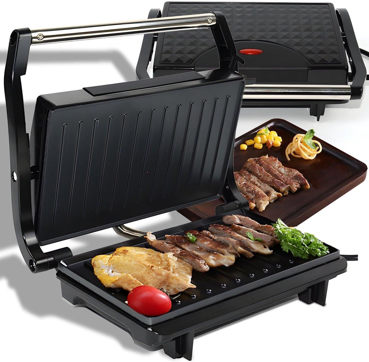 KONTAKTOWY GRILL ELEKTRYCZNY OPIEKACZ SKŁADANY TOSTER PANINI KANAPEK 750W Nowoczesny grill elektryczny – Szybko i sprawnie przygotujesz pyszne, ciepłe posiłki dla siebie i całej rodziny. Izolowany uchwyt – Bezpieczny w użytkowaniu, eliminując ryzyko poparzeń podczas grillowania. Powłoka nieprzywierająca (NON-stick) – Zapobiega przywieraniu jedzenia, ułatwia czyszczenie i zapewnia komfort gotowania. Pyszne potrawy na małej przestrzeni – prosty grill, wielka wygoda! Kompaktowy rozmiar – Grill idealnie sprawdza się w małych przestrzeniach, pozwalając na przygotowanie pysznych potraw bez potrzeby zajmowania całego blatu kuchennego. Smukła konstrukcja – Ułatwia przechowywanie, dzięki czemu urządzenie nie zajmuje dużo miejsca w kuchni. Łatwy w obsłudze – Nie musisz być szefem kuchni, aby przyrządzić smaczny posiłek. Grill jest prosty i intuicyjny w użytkowaniu. Bezpieczne grillowanie dla każdego – ciesz się smacznymi potrawami bez ryzyka! Bezpieczeństwo na pierwszym miejscu – Grill elektryczny wyposażony jest w izolowany uchwyt, który pozostaje chłodny podczas pracy, eliminując ryzyko poparzeń. Intuicyjne sterowanie – Elementy sterujące sprawiają, że grillowanie staje się proste i bezproblemowe, nawet dla początkujących. Elektryczne źródło ciepła – Zastosowanie prądu jako źródła ciepła zwiększa bezpieczeństwo, eliminując potencjalne zagrożenia związane z tradycyjnym grillowaniem. Szybkie czyszczenie, więcej czasu na przyjemności! Łatwy w czyszczeniu – Dzięki powłoce nieprzywierającej, nasz opiekacz zapobiega przypalaniu potraw, co sprawia, że czyszczenie jest szybkie i proste. Bez żmudnego szorowania – Nie potrzebujesz już agresywnych środków czyszczących ani długiego czasu na szorowanie. Wystarczy delikatnie umyć i osuszyć płyty grillowe. Błyskawiczne sprzątanie – Utrzymanie czystości nigdy nie było łatwiejsze, dzięki czemu możesz spędzać więcej czasu na cieszeniu się posiłkami, a mniej na czyszczeniu urządzenia. Grilluj zdrowiej – mniej tłuszczu, więcej smaku! Innowacyjna technologia – Nasz grill został zaprojektowany z myślą o ekonomicznym i zdrowym grillowaniu, redukując zużycie energii i czasu. Nieprzywierające płyty – Dzięki powłoce NON-stick, grill nie wymaga użycia oleju czy tłuszczu, co sprawia, że przygotowywane posiłki są zdrowsze, lżejsze i mniej kaloryczne. Zdrowe grillowanie – Posiłki przyrządzane na tym grillu zawierają mniej tłuszczu, co czyni je idealnym rozwiązaniem dla osób dbających o zdrowie i sylwetkę. Jeden grill, mnóstwo możliwości – przygotuj ulubione potrawy! Wielofunkcyjność w kuchni – Nasz grill elektryczny doskonale radzi sobie z przygotowaniem różnorodnych potraw, od mięsa i ryb, po chrupiące panini, świeże warzywa, kanapki i soczyste steki. Pełna swoboda wyboru – To Ty decydujesz, co przygotujesz! Grill umożliwia gotowanie szerokiej gamy dań, spełniając kulinarne potrzeby każdego domowego szefa kuchni. Smaczne i zdrowe posiłki – Bez względu na to, czy preferujesz mięso, ryby, czy warzywa, grill elektryczny przygotuje je szybko i zdrowo. Zalety Intuicyjna i prosta obsługa Zdrowie i redukcja tłuszczu, dzięki nieprzywierającym płytom Kompaktowe rozmiary Szybkość przygotowywania różnorodnych potraw Wszechstronność kulinarna Bezpieczeństwo użytkowania Mobilność i przechowywanie Łatwe czyszczenie Specyfikacja techniczna Napięcie: 220V-240V V, Moc znamionowa: 750 W, Rozmiar produktu: 26 x 21,5 x 8 cm, Długość kabla: 55 cm, Materiał: Plastik + powłoka PTFE, Kolor: czarny. Zawartość zestawu Grill elektryczny, Instrukcja obsługi, Oryginalne opakowanie.