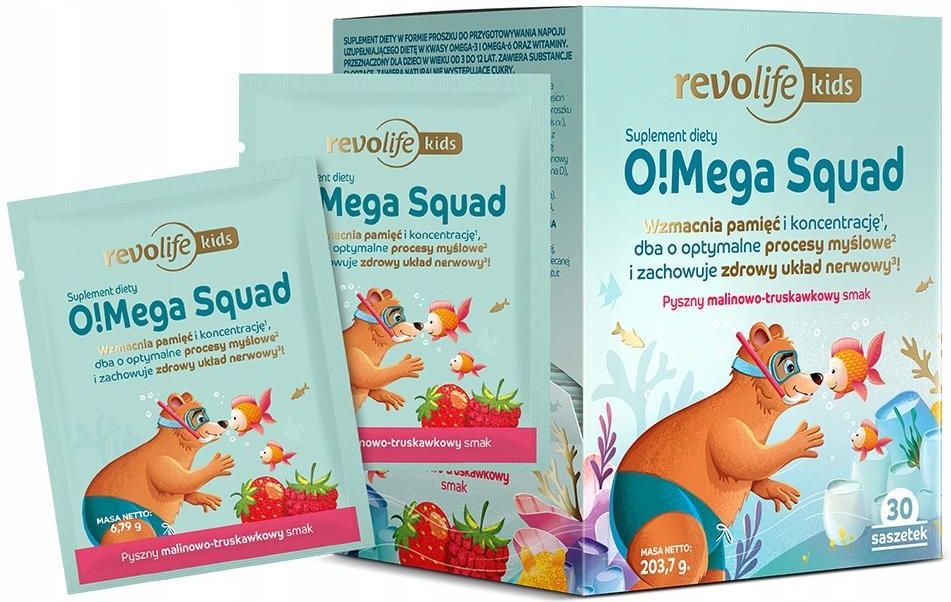 Zestaw Revolife Kids O!Mega Squad smak malinowo-truskawkowy, 30 saszetek + Tytanki, 60 żelek bez cukru Zestaw zawiera Revolife O!Mega Squad smak malinowo-truskawkowy, 30 saszetek Revolife Kids Tytanki, 60 żelek bez cukru Revolife - O!Mega Squad o smaku truskawka-malina - 30 saszetek Suplement diety dla dzieci 3+ o pysznym smaku i konsystencji smoothie O!Mega Squad to innowacyjny suplement diety stworzony z myślą o kompleksowym wsparciu zdrowia dzieci w kluczowym okresie ich rozwoju Produkt dzięki wyjątkowej formule wspiera prawidłowy rozwój mózgu, układu nerwowego, odpornościowego oraz zdrowie kości. zawiera wysokiej jakości kwasy tłuszczowe omega-3 (DHA IΕΡΑ) oraz omega-6, witaminy i metylowany kwas foliowy (L-metylofolian wapnia Extrafolate S Crystal) Dla kogo O!Mega Squad? O!Mega Squad jest idealnym rozwiązaniem dla Dzieci w wieku przedszkolnym i szkolnym - wspiera dynamiczny rozwój mózgu oraz poprawia koncentrację. Maluchów w wieku 3-12 lat - w tym okresie intensywnie kształtują się funkcje poznawcze, a suplement wspomaga procesy intelektualne. Dzieci z deficytami funkcji poznawczych - skuteczne wsparcie w przypadku trudności w nauce i koncentracji. Dzieci z obniżoną energią - pomoże w walce z uczuciem zmęczenia oraz znużenia. Maluchów z wybiórczością pokarmową - dostarcza cennych składników w przypadku ograniczonego dostępu do pełnowartościowej diety. Dzieci mających trudności w nauce - wykazujących skłonność do nadpobudliwości czy do szybkiego rozpraszania uwag. Dlaczego warto? CZYSTY I PRZYJAZNY SKŁAD - bez dodatku cukru, sztucznych aromatów i barwników. Pyszny smak truskawki i maliny pochodzi wyłącznie z naturalnych składników, takich jak sproszkowane truskawki, sok z malin oraz stewia i erytrytol. KOMPLEKSOWE DZIAŁANIE - jest źródłem kwasów omega-3 i 6, witamin (w tym witaminy A, C, D, E oraz witamin z grupy B), biotyny, kwasu foliowego w formie metylowanej (L-metylofolian wapnia Extrafolate S Crystal®) i niacyny. INNOWACYJNY OLEJ Z ALG W PROSZKU - dzięki mikrokapsułkowaniu oleju z alg możliwe było stworzenie wygodnej formuły saszetek do rozpuszczania w wodzie. PYSZNY SMAK I KONSYSTENCJA SMOOTHIE - formuła suplementu umożliwia przygotowanie roztworu o aksamitnej konsystencji smoothie i pysznym, owocowym smaku (bez odbijania i aromatu ryby). Składniki aktywne O!Mega Squad zapewnia dziecku dzienną dawkę substancji odżywczych i witamin, które są niezbędne do świadomego i aktywnego poznawania świata, do harmonijnego rozwoju oraz prawidłowego funkcjonowania układu odpornościowego. Kwas dokozaheksaenowy i kwas eikozapentaenowy (DHA 250 mg i EPA 1,5 mg) (kwasy tłuszczowe omega-3)- przyczyniają się do prawidłowego funkcjonowania mózgu, układu nerwowego i funkcji psychologicznych Kwas gamma-linolenowy (GLA 20 mg) (kwas tłuszczowy omega-6) -ma pozytywny wpływ na kondycję i mechanizmy obronne skóry Witamina C (80 mg) - przyczynia się do prawidłowego funkcjonowania kości, chrząstek, dziąseł i zębów oraz układu odpornościowego Witamina B5 (2,25 mg) - przyczynia się do utrzymania prawidłowego metabolizmu energetycznego i pomaga w utrzymaniu sprawności umysłowej Niacyna (6 mg) -przyczynia się do zmniejszenia uczucia zmęczenia i znużenia oraz do utrzymania prawidłowego stanu błon śluzowych i zachowania zdrowej skóry Witamina B6 (0,525 mg) - pomaga w prawidłowym funkcjonowaniu układu nerwowego i utrzymaniu funkcji psychologicznych Witamina B12 (0,938 µg) - odgrywa rolę w procesie podziału komórek i pomaga w prawidłowym funkcjonowaniu układu odpornościowego Witamina E (4,5 mg) - pomaga w ochronie komórek przed stresem oksydacyjnym Biotyna (18,75 µg) - przyczynia się do utrzymania prawidłowego metabolizmu składników odżywczych, a także pomaga w zachowaniu zdrowych włosów i skóry Witamina A (150 µg) - odgrywa rolę w procesie specjalizacji komórek oraz przyczynia się do utrzymania prawidłowego metabolizmu żelaza Witamina D (20 µg) - pomaga w prawidłowym wchłanianiu i wykorzystywaniu wapnia oraz fosforu, a także w utrzymaniu prawidłowego poziomu wapnia we krwi, dla zdrowych zębów i kości Kwas foliowy (100 µg) - pomaga w prawidłowej produkcji krwi bierze udział w procesie podziału komórek Olej z alg w mikrokapsułkach O!Mega Squad zawiera olej z alg Schizochytrium sp., który pochodzi z kontrolowanych hodowli, dzięki czemu nie ma kontaktu z zanieczyszczonymi wodami morskimi. To zapewnia czystość surowca i bezpieczeństwo stosowania. Olej charakteryzuje się bardzo niskim wskaźnikiem Totox (3,9), co oznacza jego świeżość i wysoką jakość. TECHNOLOGIA MIKROKAPSUŁKOWANIA Dzięki technologii mikrokapsułkowania, olej z alg jest chroniony przed wilgocią, światłem i innymi czynnikami, co wydłuża jego trwałość. Mikrokapsułki kontrolują uwalnianie substancji w jelitach, poprawiając wchłanialność oraz maskując nieprzyjemny smak i zapach oleju. Stosowanie i dawkowanie Suplement diety O!Mega Squad w postaci proszku w saszetkach jest łatwy w użyciu - wystarczy rozpuścić go w wodzie, mleku lub jogurcie. Zalecana dzienna dawka to 1 saszetka, którą należy rozpuścić w 100 ml płynu. Produkt nie może zastępować zróżnicowanej diety, a jego stosowanie nie jest wskazane dla osób uczulonych na którykolwiek ze składników. Ważne jest prowadzenie zdrowego trybu życia i zrównoważonej diety. Skuteczność i bezpieczeństwo Suplement diety O!Mega Squad marki Revolife powstał z myślą o zdrowiu i bezpieczeństwie użytkowników, dlatego nie zawiera sztucznych aromatów, barwników ani dodatku cukru. Zawiera jedynie naturalne cukry pochodzące z użytych składników oraz starannie wyselekcjonowane substancje aktywne, które są bezpieczne i skuteczne. Revolife eliminuje zbędne dodatki, takie jak substancje drażniące czy alergizujące, zapewniając najwyższą jakość i wspierając zdrowie młodych odkrywców. Jest produkowany i