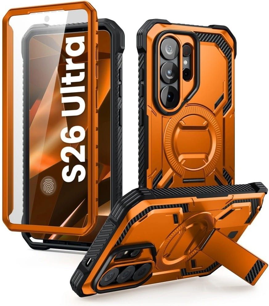 Etui Supcase i-Blason Armorbox Mag KickStand (SP) Samsung Galaxy S26 Ultra Hybrydowa konstrukcja zgodna z MagSafe Oryginalne etui od marki Supcase i-Blason z serii Armorbox Mag KickStand charakteryzujące się pancerną budową typu "heavy-duty case" od upadków o taktycznym, stanowczym i wyróżniającym się wyglądzie. Jest stylowe a zarazem wielofunkcyjne, dzięki czemu świetnie sprawdzi się podczas wielu codziennych i wymagających sytuacji. Futerał wykonano z połączenia amortyzującego termopoliuretanu oraz mocnego poliwęglanu. Obudowa posiada rozkładaną podpórkę KickStand, oraz jedną ramkę frontową z wbudowaną osłoną ekranu. Dzięki wbudowanemu pierścieniowi pokrowiec jest kompatybilny z akcesoriami MagSafe. Kolor producenta: Coral (pomarańczowo-czarny) Z czego składa się Armorbox Mag KickStand Budowa etui składa się z dwóch części: tylnych plecków przedniej ramki z wbudowaną osłoną ekranu między które wkładamy telefon i składamy konstrukcję w jedną całość, co zapewnia kompleksową ochronę całego urządzenia. Ramkę z wbudowaną osłoną ekranu nakładamy bezpośrednio na samo urządzenie, które nie może mieć naklejonych żadnych dodatkowych folii ani szkła. Pancerna i wytrzymała ochrona Obudowa oferuje wysoką ochronę przed wstrząsami spełniając, a nawet przekraczając normy wojskowego standardu odporności Mil-Grade. To świetny wybór, który sprawdzi się nie tylko podczas ekstremalnych wycieczek czy sportów, ale także np. w wymagających zawodach, gdzie nieodzownym kryterium jest zabezpieczenie smartfona przed zarysowaniami i uderzeniami z jednoczesnym zachowaniem wygody jego użytkowania. Obudowa posiada lekko wystające krawędzie chroniące kamerę i ekran przed zarysowaniami na płaskich powierzchniach, co pozwala na swobodne korzystanie np. z gestów wyciszania. Dowolnie odkładaj telefon na blat biurka bez obaw o porysowanie niezakrytych elementów. Precyzyjnie dopasowane wycięcia konstrukcyjne Precyzyjne wycięcia zapewniają swobodny dostęp do wszystkich interfejsów, jak np. głośniki, mikrofon, port ładowania, itp. oferując niezwykłą funkcjonalność i wygodę w użytkowaniu. Cover posiada także responsywne, zintegrowane osłony przycisków zachowujące dobrze wyczuwalne kliknięcie. Poziomy i pionowy Stand Pomysłowa nóżka KickStand służy za podstawkę, dzięki której z łatwością ułożysz swojego smartfona w pozycji poziomej lub pionowej dla łatwiejszego przeglądania multimediów czy prowadzenia rozmów wideo. Stojak łatwo się rozkłada i składa, i stanowi on integralną część futerału, dzięki czemu zawsze jest dostępny w razie potrzeby. Kompatybilność z akcesoriami MagSafe Etui posiada wbudowany pierścień magnetyczny, który umożliwia swobodne korzystanie z wszelkiej gamy akcesoriów zgodnych z mocowaniem w systemie MagSafe bez potrzeby zdejmowania futerału. Warstwa klejąca w miejscu ekranowego czytnika W miejscu ekranowego czytnika linii papilarnych znajduje się warstwa klejąca, która pozwala na dokładne przyleganie zintegrowanej osłony ekranu w tym miejscu, w celu zwiększenia jego czułości dla prawidłowego skanowania odcisku palca. Należy mieć na uwadze, że to miejsce będzie się wizualnie odróżniać od pozostałej powierzchni ochrony wyświetlacza, która nie posiada kleju. UWAGA: Klej w miejscu ekranowego czytnika linii papilarnych jest jednorazowego użytku! Zdejmowanie osłony skutkuje zużyciem się warstwy klejącej i spadkiem jakości działania skanera linii papilarnych, uniemożliwiając jego poprawne działanie w przypadku ponownego montażu.
