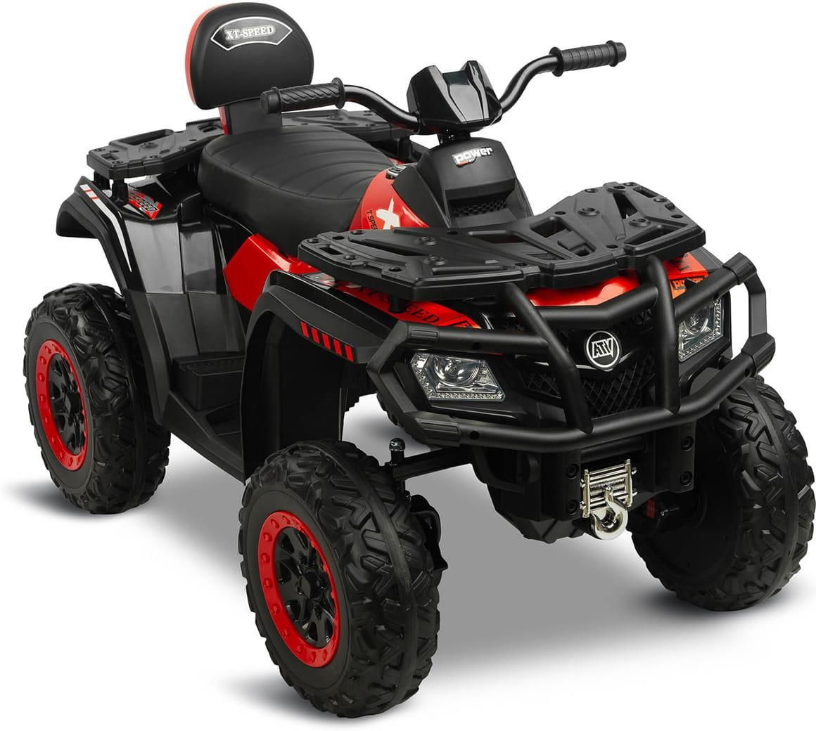 TOYZ POJAZD NA AKUMULATOR RUSH 4X4 Quad Rush marki Toyz to pojazd na akumulator, w którym dziecko przeżyje wyjątkowe terenowe przygody i odkryje nowe drogi. Dzięki swojemu kompaktowemu rozmiarowi jest idealny do jazdy niemal w każdym miejscu i czasie. Napęd na 4 koła połączony z mocnymi 80W silnikami pozwolą na odkrywanie nowych terenów z łatwością i swobodą. Komfort jazdy zapewniają tylne amortyzatory, duże koła z pianki EVA, wolny start, automatyczny hamulec oraz siedzisko z oparciem wykończone ekoskórą. Dodatkowo Rush posiada panel multimedialny z bluethooth, który umili czas spędzony za kierownicą. W zestawie znajduje się również pilot zdalnego sterowania Najważniejsze cechy: Kompaktowy rozmiar różne możliwości zabawy – dziecko może samodzielnie prowadzić samochód akumulatorowy lub opiekun może sterować zdalnie pilotem obszerne siedzisko z ekoskóry koła z pianki EVA z głębokim bieżnikiem automatyczny hamulec Przednie światła LED panel multimedialny z USB, Radiem FM i bluetooth oraz wgranymi melodiami wyjątkowa moc dzięki czterem silnikom 80W dwie prędkości jazdy Dane techniczne: Przedział wiekowy: 3 – 8 lat Wymiary: 112x66x69 cm Waga produktu: 21,1 kg Limit wagowy: 59 kg Zasilanie: 4 x silnik 80W 24V / 1 x akumulator (7Ah 24V) Wymiary siedziska: 39x23 cm Wysokość oparcia: 19 cm Wymiary opakowania: 107x57x48 cm Waga brutto: 24,1 kg
