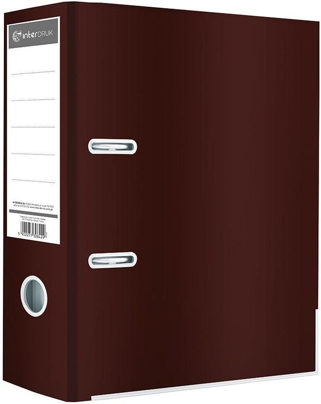 Segregator A4 w kolorze brązowym z połyskiem INTERDRUK Prezentowany segregator A4 od INTERDRUK to doskonałe rozwiązanie do przechowywania i organizacji dokumentów. Wykonany jest z wysokiej jakości materiałów, które zapewniają trwałość i odporność na uszkodzenia. Okładka segregatora została wykonana z twardych i trwałych materiałów, dzięki czemu jest odporna na uszkodzenia i zarysowania. Ochronna folia błysk nadaje eleganckiego wyglądu oraz dodatkowo zabezpiecza przed działaniem czynników zewnętrznych.Wewnętrzna część segregatora wyposażona jest w papierową wyklejkę, która ułatwia utrzymanie porządku i chroni przechowywane dokumenty. Segregator posiada 2 ringi oraz dźwignię z dociskaczem, co ułatwia zarówno wkładanie, jak i wyjmowanie papierów.Aby ułatwić przenoszenie segregatora i zminimalizować ryzyko poranienia, produkt ten został wyposażony w wzmocniony otwór na palec, co zwiększa jego użytkową wygodę. Dodatkowo, dolne krawędzie segregatora zostały usztywnione metalową szyną, co zapobiega jego deformacji pod wpływem ciężaru przechowywanych dokumentów.W produkt przewidziana jest wymienna etykieta grzbietowa, co umożliwia szybkie i łatwe znalezienie poszukiwanego segregatora poprzez umieszczenie krótkiego opisu zawartości. Szerokość grzebietu tego modelu to 75mm, co pozwala na przechowywanie dużej liczby dokumentów w jednym miejscu.Podsumowując, prezentowany segregator A4 INTERDRUK to doskonałe narzędzie do przechowywania i organizacji dokumentów w formacie A4. Praktyczny, elegancki i trwały - sprawdzi się w każdym biurze. EAN: 5902277308429