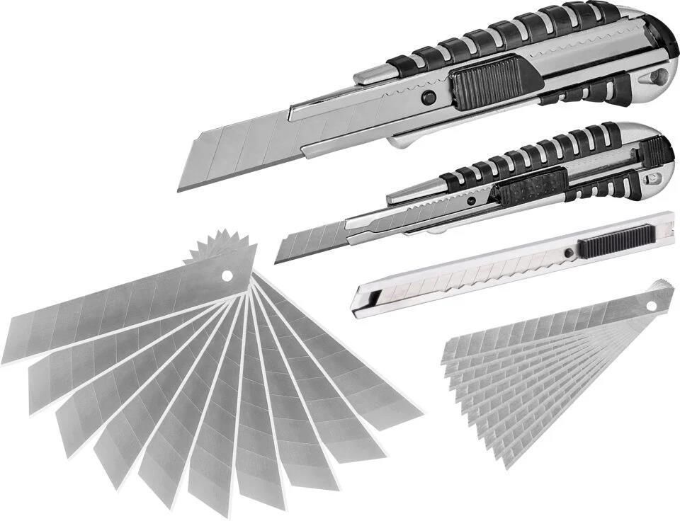 Zestaw nożyków introligatorskich zawierający 43 elementy!Zestaw nożyków introligatorskich marki Meec Tools nadaje się idealnie dla wszystkich, którzy potrzebują uzupełnić skrzynkę narzędziową o noże do uniwersalnych zastosowań. Ostrza sprawdzą się doskonale do cięcia na przykład tworzywa, kartonu lub gipsu. Noże i ostrza Zestaw 43 elementów zawiera zarówno noże, jak i ostrza w różnych rozmiarach. Zestaw zawiera: 20 ostrzy 9 mm; 20 ostrzy 18 mm; 1 nóż 9 mm. Długość: 130 mm, ostrze 9 mm; 1 nóż 18 mm. Długość: 155 mm, ostrze 18 mm; 1 wąski nóż 9 mm. Długość: 130 mm, ostrze: 9 mm. Wymienne ostrza W zestawie z nożami otrzymujesz także aż 40 wymiennych ostrzy wykonanych ze stali węglowej wysokiej jakości. Ostrza długo utrzymują ostrość i nadają się najlepiej do cięcia takich materiałów jak tektura, tworzywo, winyl czy gips. Ostrza są dostarczane w futerale z twardego tworzywa.Korpus z metaluKorpus został wykonany z metalu odpornego na korozję zapewniającego dłuższą żywotność. Wąski nóż introligatorski jest wyposażony w zaczep na kieszeń, dzięki czemu nadaje się idealnie, gdy chcesz mieć pod ręką nóż do lżejszych prac. Ogumowane powierzchnie chwytneNoże zostały wyposażone w zabezpieczenie zmniejszające ryzyko wyślizgnięcia się dłoni. Natomiast ogumowane powierzchnie chwytne pozwalają na bardzo bezpieczne i łatwe manewrowanie nożem.