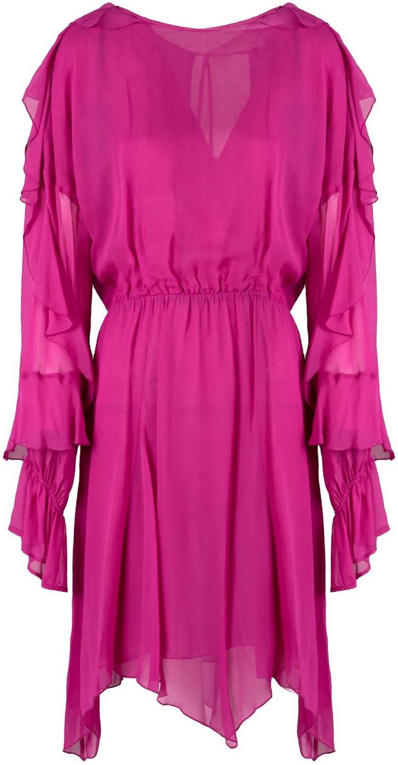 Prosty fason tej sukienki sprawia, że jest niezwykle uniwersalna i doskonale komponuje się z różnorodnymi dodatkami, podkreślając Twoją naturalną elegancję. Z okrągłym dekoltem, który subtelnie eksponuje szyję, dodając całości delikatności i klasy, idealnie nadaje się na każdą okazję. Z pęknięciem i wiązaniem na plecach, które nie tylko przyciąga wzrok, ale także dodaje sukience nieco zmysłowego charakteru, czyniąc ją wyjątkową w swojej prostocie. Wiązanie ozdobione firmowym detalem dodaje unikalności i pokazuje dbałość o każdy szczegół, co sprawia, że jest to prawdziwie luksusowy element garderoby. W pasie wszyta guma zapewnia idealne dopasowanie do sylwetki, podkreślając jej atuty i zapewniając komfort noszenia przez cały dzień. Rękawy ozdobione falbanami wprowadzają nutę romantyzmu i lekkości, co czyni tę sukienkę doskonałym wyborem na wiosenne i letnie dni. Wykonana z wysokiej jakości tkaniny, która zapewnia nie tylko trwałość i wygodę, ale także elegancki wygląd, który przyciąga spojrzenia. Wyprodukowana we Włoszech, co gwarantuje najwyższą jakość wykonania oraz niepowtarzalny styl, który jest synonimem włoskiej mody i elegancji.
