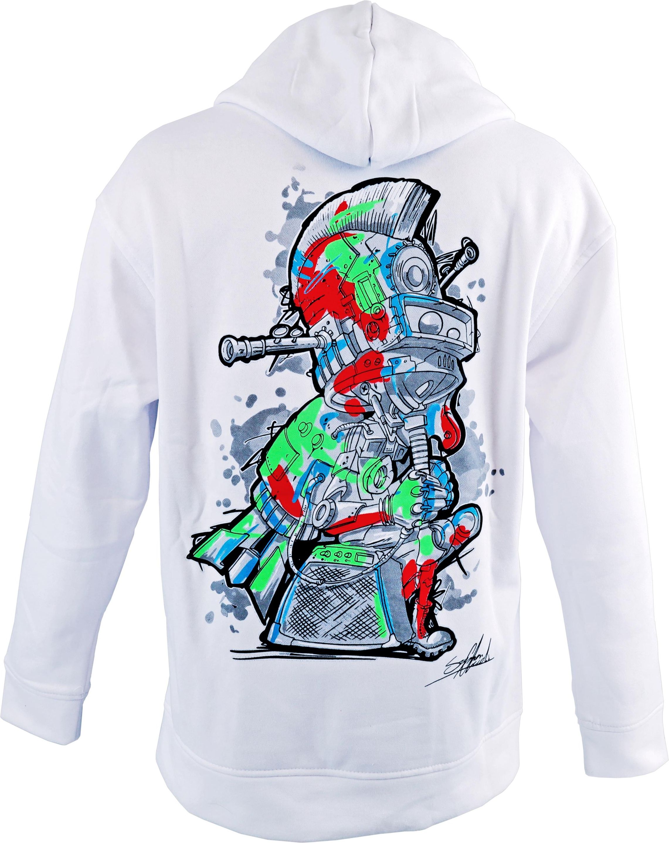 Odzież można kupić tylko w Salonach muzycznych Riff oraz na stronie www.riff.net.pl Jest to seria limitowana, więc trzeba się spieszyć z kupnem. Szymon Chwalisz to artysta, malarz, grafik, designer, absolwent UAM EASP (dyplom z malarstwa). Tworzy w technice olejnej od blisko 20 lat. Jego prace znajdują się w kolekcjach prywatnych w kraju i za granicą. W swojej sztuce łączy formalny surrealizmem z elementami pop-artu. Jego prace zawsze przemawiają mocną i kontrowersyjną treścią. Artysta znany jest również z tworzenia w technice aerografu, w której to od lat wykonuje słynne "PolandRockowe Gitary" dla Fundacji WOŚP, które osiągają kosmiczne ceny na aukcjach. Bluza biała z kapturem, w typie kangurki. Wnętrze kaptura w kontrastowym kolorze. Sznurki w kolorze bluzy. Naszyta kieszeń kangurka. Rozmiar: S Kolor: Biały Wzór: Rock Typ: Unisex Skład materiału: 35% bawełna / 65% poliester Gramatura: 265 g/m²