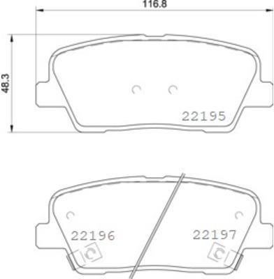 Parametry: Artykuł uzupełniający / informacja uzupełniająca 2: z podkładką wytłumiającą Numer WVA: 22195, 22196, 22197 System hamulcowy: Mando Artykuł uzupełniający / informacja uzupełniająca: z dodatkami Styk ostrzegawczy o zużyciu: z akustycznym czujnikiem zużycia Ilość wskaźników zużycia okładzin: 2 na oś Wysokość: 48,2 mm Szerokość: 116,8 mm Grubość: 15,6 mm