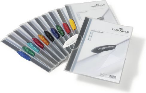 Skoroszyt zaciskowy formatu A4 z kolekcji Swingclip wykonany z elastycznego polipropylenu umieszczony na bocznej krawędzi zacisk obrotowy z tworzywa sztucznego o eliptycznym kształcie w kolorze czerwonym przednia i tylna okładka transparentna mieści do 30 kartek zaletą zacisku jest to, że nie ma konieczności dziurkowania dokumentów skoroszyt jest doskonałym narzędziem pomocniczym dla prezentacji, materiałów szkoleniowych, opinii itp., a także dla porządkowania i przechowywania ofert, raportów i innych dokumentów transparentny z czerwonym zaciskiem