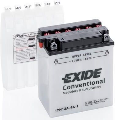 Akumulator 12 Ah EXIDE conventional 12N12A-4A-1 Numer katalogowy części: 12N12A-4A-1 Numery katalogowe zamienników: CB12A-A, YB12A-A Napięcie: 12 V Pojemność: 12 Ah Prąd rozruchowy EN: 115 A Biegunowość: lewy + Typ biegunów: M06 Mocowanie: B0 Producent: EXIDE Numer skrócony: 12N12A-4A-1 Długość: 135 mm Szerokość: 80 mm Wysokość: 160 mm Waga: 3,9kg Model akumulatora: CONVENTIONAL Typ akumulatora: Rozruchowy / Kwasowy / Suchoładowany z elektrolitem EAN: 3661024033282 Exide dostarcza najwyższej jakości akumulatory do motocykli, zaprojektowane dla tych, którzy mają wysokie wymagania wobec swoich pojazdów. Nasze produkty znane są z niezawodności i doskonałej żywotności. Dostarczamy akumulatory do: motocykli, skuterów, skuterów wodnych oraz szerokiej gamy innych pojazdów. Nasze akumulatory umożliwiają nie tylko pokonanie codziennej drogi do pracy – pozwalają także na dotarcie do dalszych celów podróży, tych lądowych i morskich. Exide jest producentem oryginalnych produktów na tzw. pierwsze wyposażenie, dysponującym najbardziej nowoczesną technologią w branży. Dzięki akumulatorom Exide możesz pewnie wyruszyć w drogę. Akumulator Exide Conventional został zaprojektowany na potrzeby podstawowych pojazdów oraz pojazdów starszego typu o podstawowym zapotrzebowaniu energetycznym. Akumulator Conventional sprawdzi się także w kosiarkach ogrodowych oraz w innych pojazdach tego typu.