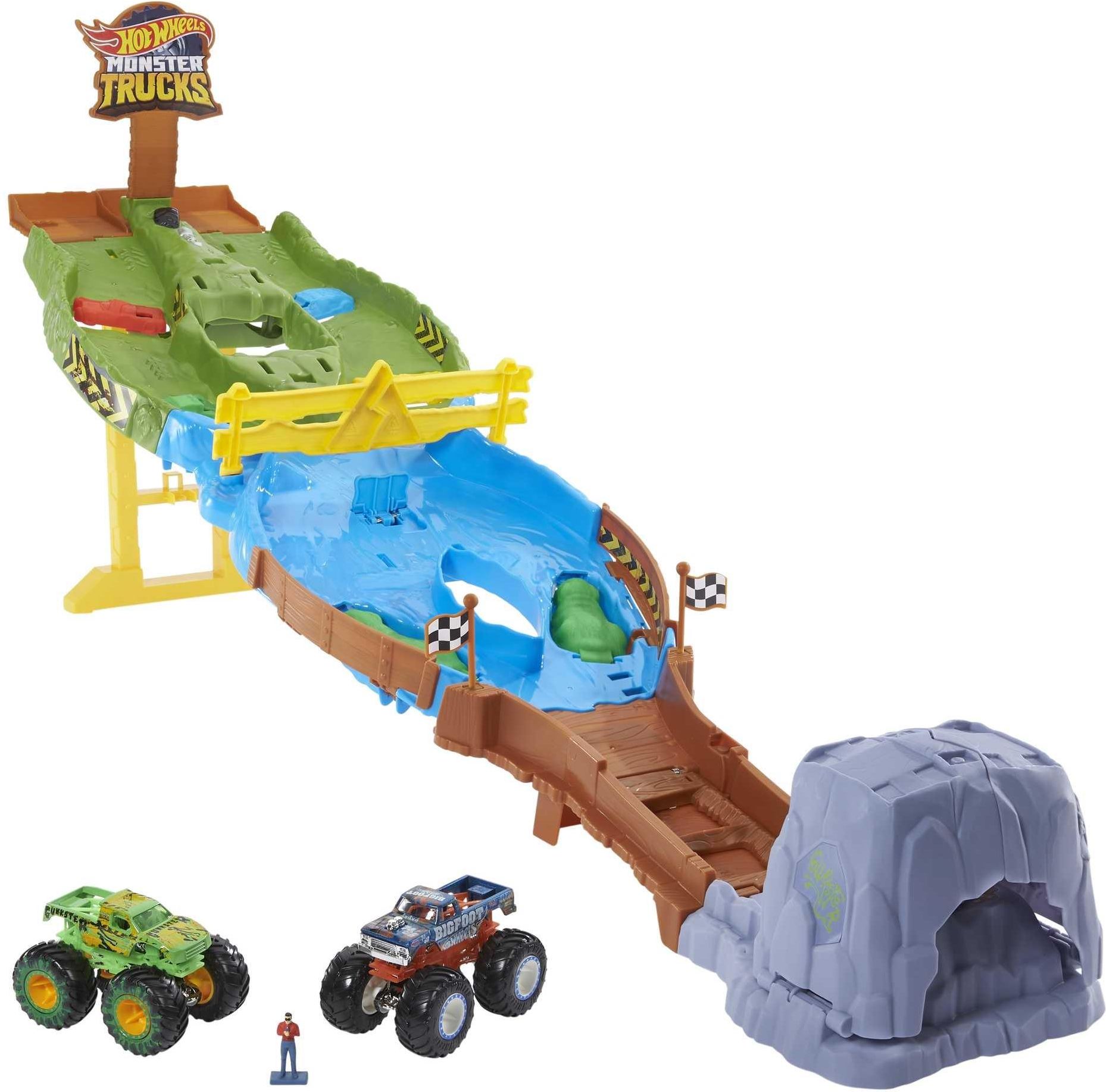 Hot Wheels® Monster Trucks Tor wyścigowy Turniej Tytanów Zestaw Wypuść równocześnie pojazdy Bigfoot i Gunkster, a potem podziwiaj epicki wyścig w dół toru! Kibicuj Monster Truckom, gdy demolują samochodziki „do zgniatania” i rozbijają przeszkody. Uważaj na krokodyla, który ukrywa się na torze! …