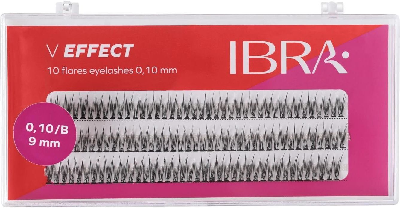 Ibra Kępki rzęs V effect 0,10 B 9mm Ibra Profesjonalne kępki ułożone w charakterystycznym kształcie litery „V” długość rzęsek zmniejsza się stopniowo od zewnętrznych stron do środka kępki, przez co nadają bardzo nowoczesny efekt znany jako "Fish Tail" oraz "Jaskółki". Przeniosą Twój makijaż w zupełnie nowy wymiar. Uzyskaj modny unikatowy look inspirowany makijażami gwiazd. Zalety kępek "V effect" marki IBRA Makeup: idealne do delikatnych stylizacji, dostępne w różnych długościach, idealne do makijażu dla osób, które wolą subtelniejszy efekt.