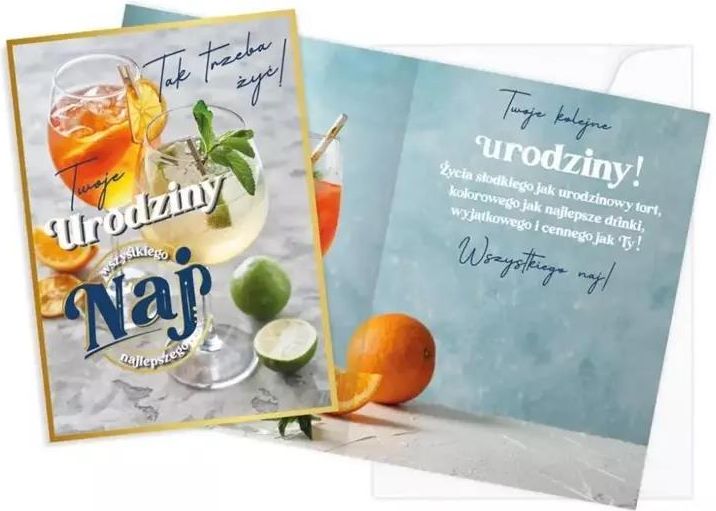 Kartka na Urodziny z nadrukiem "Urodziny (drinki)" o wymiarach 140 mm na 190 mm. Kartki z serii Vision to świetny pomysł na piękną pamiątkę! Każda kartka posiada dopasowaną kolorystycznie kopertę w komplecie. W środku kartki znajduje się krótki tekst z życzeniami, a pod spodem jest miejsce na własną dedykację Karnety, znane również jako kartki, to uniwersalny produkt, który znajduje zastosowanie w wielu sytuacjach. Mogą być używane jako kartki z okazji różnych uroczystości, takich jak urodziny, śluby, chrzty czy Boże Narodzenie, ale również jako karty podziękowania lub życzenia powrotu do zdrowia. Uniwersalność - karnety można wykorzystać w różnych sytuacjach, od urodzin po Boże Narodzenie, dzięki czemu są to uniwersalne prezenty. Osobisty charakter - wpisanie własnych życzeń i dedykacji na karcie sprawia, że prezent staje się bardziej osobisty i dedykowany konkretnemu odbiorcy. Estetyka - karnety zazwyczaj są bardzo estetyczne i eleganckie, co dodaje im wartości jako prezentu.
