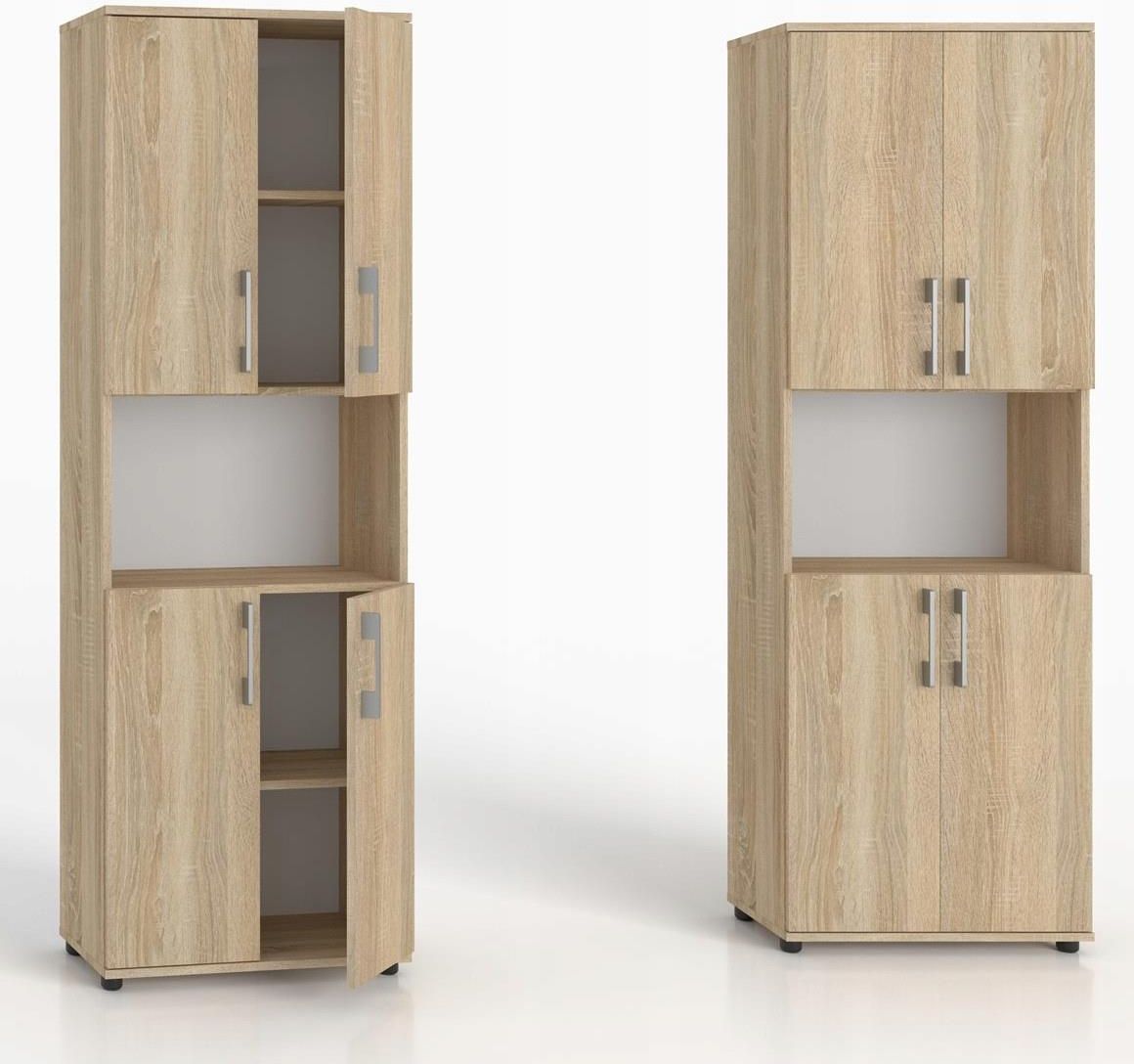 Regał biurowy do salonu, pracowni, sypialni na segregatory i książki Szafa biurowa z półką otwartą M 4D dąb sonoma 80 x 32 cm Regał na segregatory i książki to doskonałe rozwiązanie do biur lub pomieszczeń domowych. Klasyczny wygląd i funkcjonalność spełnią oczekiwania najbardziej wybrednych klientów. Informacje dodatkowe klasyczne wzornictwo pięć wytrzymałych półek dopasowany do segregatorów biurowych podwyższona odporność na zarysowania nóżki w kolorze czarnym 3 cm korpus i front w kolorze dąb sonoma dostępne inne wersje regału M Regał do samodzielnego montażu z czytelną instrukcją. Wymiary regału szerokość 80 cm wysokość 182 cm głębokość 32 cm odległość miedzy półkami 33 cm Wnętrze regału. Regał wyposażono w półkę otwartą oraz czworo drzwiczek, za którymi znajdują się cztery półki. Materiał. Korpus oraz front wykonano z płyty laminowanej producenta Kronopol o grubości 16 mm w kolorze dąb sonoma. Plecy zrobiono z płyty HDF 3 mm. Obrzeża. Krawędzie płyty są oklejone PCV odpornym na wilgoć i zarysowania.