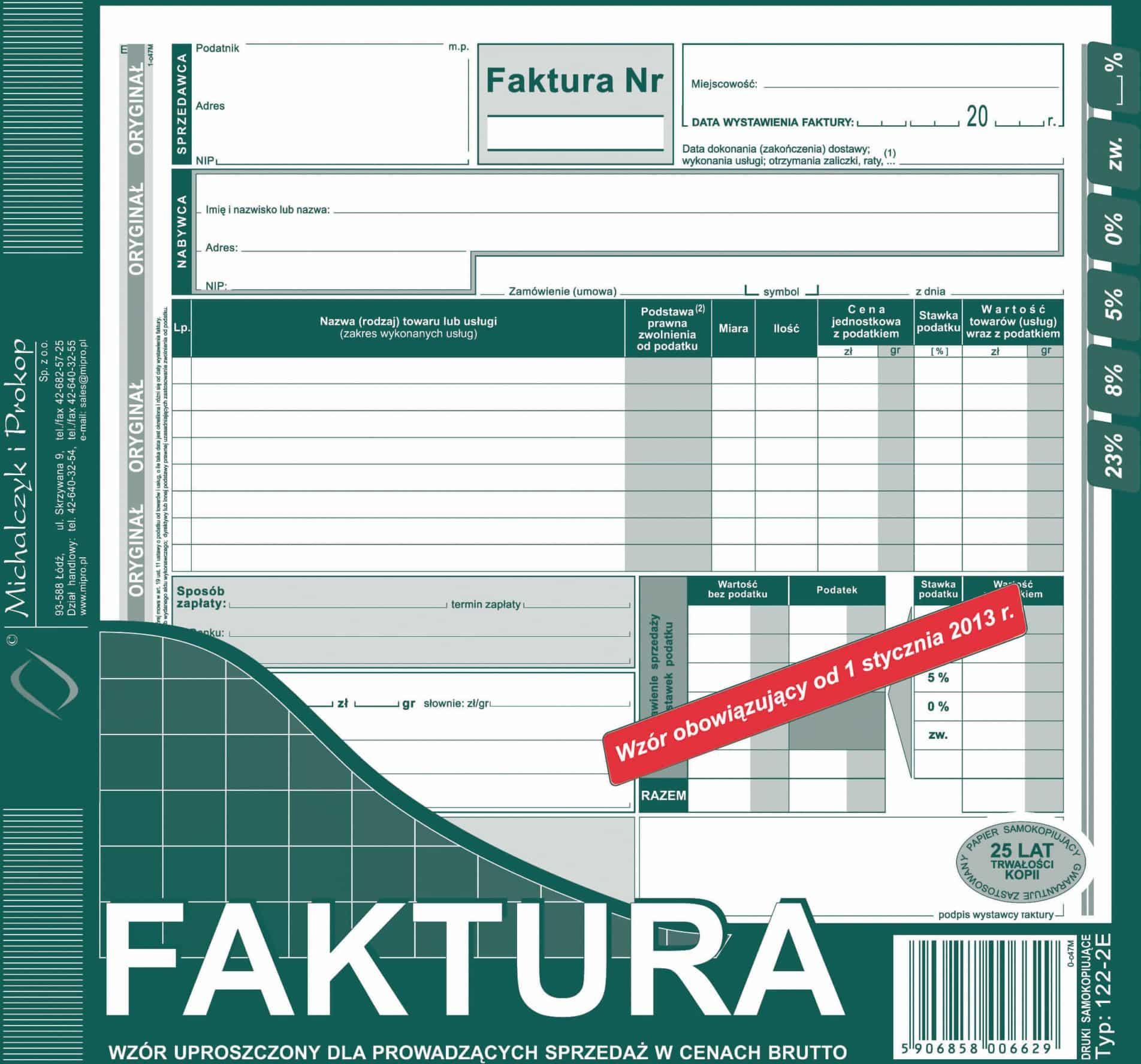 122-2E FAKTURA WZÓR UPROSZCZONY DLA PROWADZĄCYCH SPRZEDAŻ W CENACH BRUTTO * format: 2/3 A4 * rodzaj papieru: samokopiujący * zastosowanie: faktury i inne dokumenty wynikające z przepisów o podatku od towarów i usług * oprawa: bloczek 80 kartek * druk: jednostronny (oryginał + kopia)