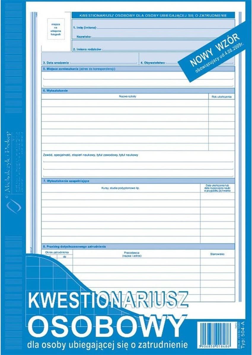 504-A1 KWESTIONARIUSZ OSOBOWY DLA OSOBY UBIEGAJĄCEJ SIĘ O ZATRUDNIENIE * format:A4 * rodzaj papieru:papier offsetowy * zastosowanie: druki kadrowe * oprawa:bloczek 40 kartek * druk:dwustronny