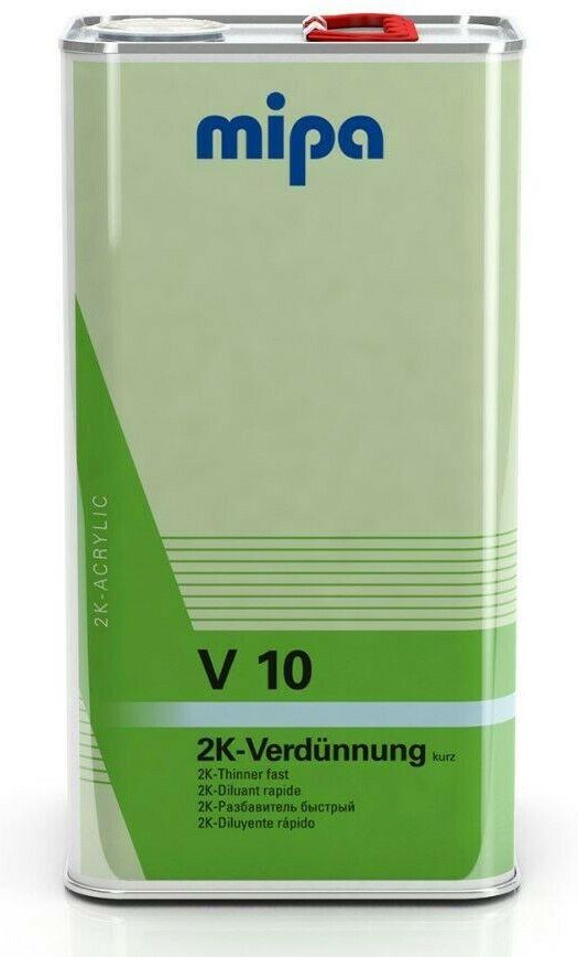 Mipa 2K Rozcieńczalnik V10 szybki - 5L Mieszanina rozpuszczalników organicznych o opóźnionym parowaniu, służący do rozcieńczania 2K podkładów, 2K lakierów i 2K lakierów bezbarwnych. Umożliwia poprawę aplikacji i absorpcję mgiełki lakierniczej podczas prac lakierniczych przeprowadzanych na obiektach wielkopowierzchniowych i /lub w wysokiej temperaturze otoczenia.