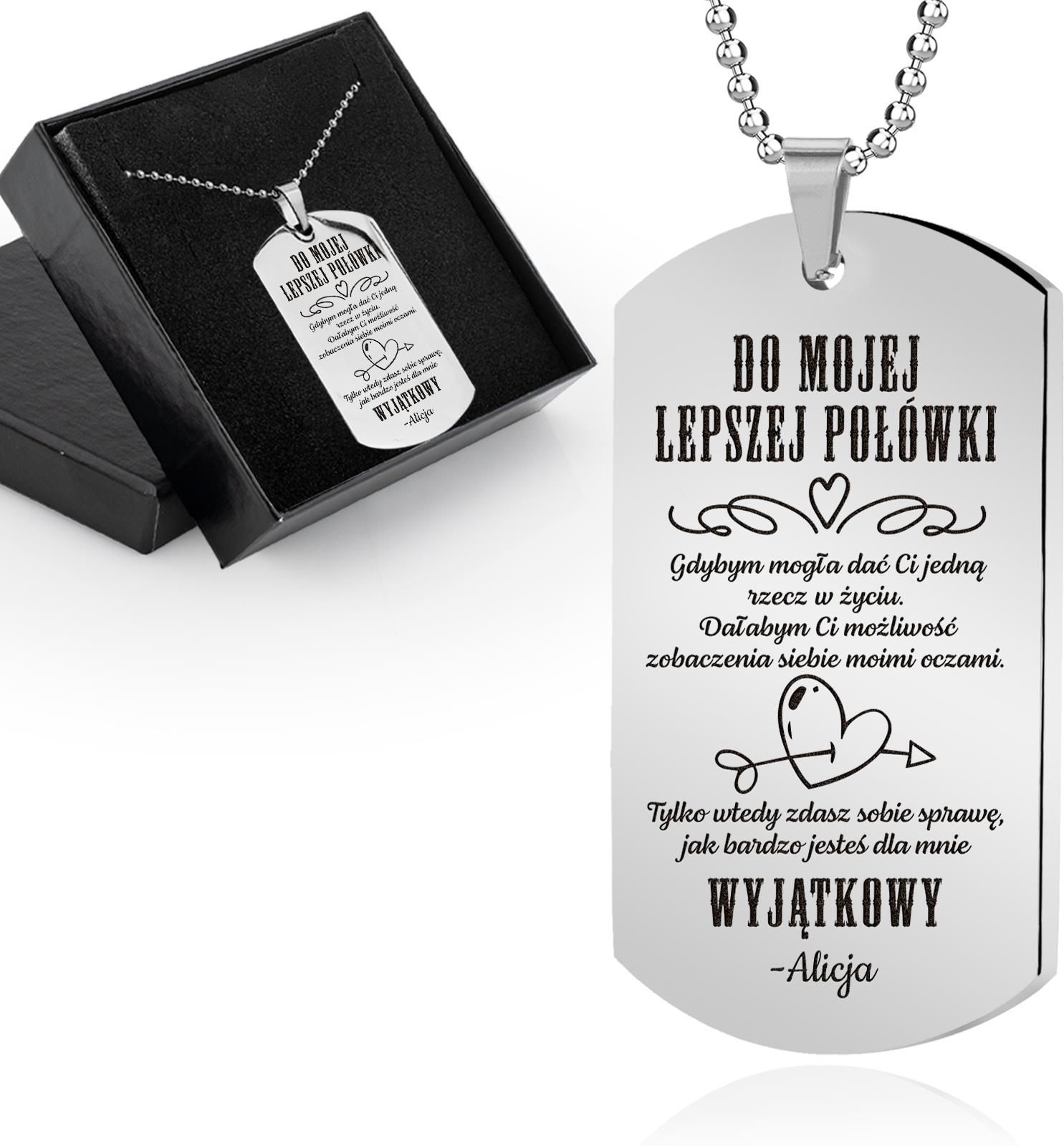 NIEŚMIERTELNIK ze STALI CHIRURGICZNEJ + łańcuszek na PREZENT dla NIEGO Nieśmiertelnik to nie tylko świetny gadżet, ale także ciekawy element biżuterii - dodatkowo grawer zaprojektowany przez Ciebie uczyni go doskonałym prezentem! Sprawdzi się doskonale jako upominek na wiele okazji - prezent na …