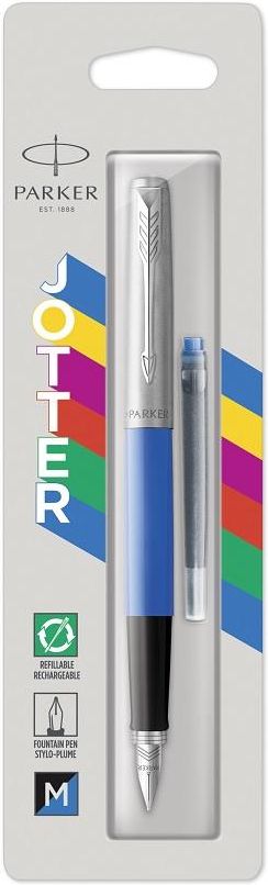 Pióro wieczne Parker Jotter stało się symbolem marki, to najbardziej rozpoznawalna i chętnie wybierana seria. Już od wielu lat zachwycają swoim wyglądem, są idealnie dopasowane do ręki, trwałe i idealnie nadają się zarówno dla kobiety jak i mężczyzny. Kolekcję piór wiecznych Parker Jotter cechuje: nowy klips w kształcie strzałki zaokrąglony pierścień potrójna strzałka wygrawerowana na stalówce. Dodano także potrójny pierścień na dolnej części korpusu pióra, który idealnie pasuje do całości.Pióro Parker Jotter świetnie sprawdzi się zarówno dla osób ceniących wygodę i wysoką jakość, jak i dla nowych, mniej doświadczonych użytkowników, którzy pragną doświadczyć przyjemnych doznań płynących z pisania. Zarówno skuwka jak i klip wykonane zostały z polerowanej stali nierdzewnej. Część przednia pióra to czarne tworzywo sztuczne, stalówka wykonana jest ze stali, grubość pisania M (medium).