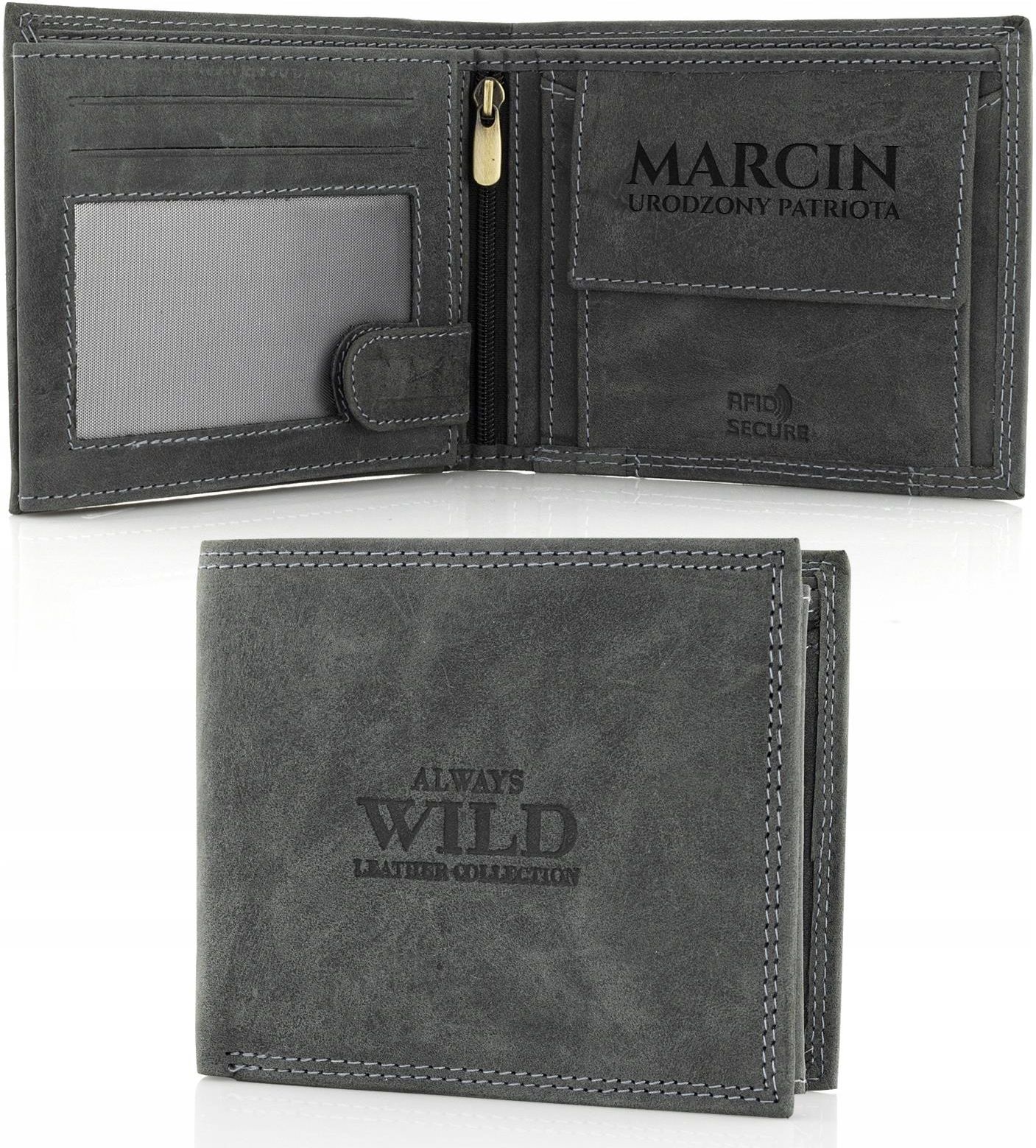 Portfel męski ze skóry naturalnej Always Wild Męski portfel wykonany z wysokiej jakości skóry naturalnej to doskonały pomysł na prezent dla każdego mężczyzny. Idealnie nadaje się na prezent z okazji urodzin, imienin czy Dnia Chłopaka. Skóra z której został wykonany stylizowana jest na postarzałą, co nadaje mu niepowtarzalny wygląd i charakter. Wewnątrz portfela możemy wykonać grawer, dzięki któremu obdarowany nim mężczyzna poczuje się naprawdę wyjątkowo. Parametry Materiał: skóra naturalna Wymiary zewnętrze po złożeniu: 12 cm x 10,3 cm x 2,5 cm 6 przegród na karty Schowek 8 x 9cm 2 schowki z siatką na zdjęcie 2 kieszenie na banknoty 9 x 23 cm Kieszeń na monety na zatrzask Wnętrze spinane patką na zatrzask Kolor: grafitowy Portfel może wydzielać zapach charakterystyczny dla obróbki cieplnej podczas grawerowania laserowego, który zniknie po kilku dniach Nr wzoru: 9902 Grawer wykonujemy techniką laserową, bezpośrednio na portfelu (wewnątrz). Dzięki wykorzystaniu nowoczesnych maszyn, grawer jest niezwykle dokładny i trwały. Maksymalna ilość tekstu jaką możemy zamieścić wewnątrz portfela wynosi 80 znaków. Dzięki wykorzystaniu nowoczesnych maszyn, obie techniki graweru są niezwykle dokładne i trwałe. Spraw by Twój prezent na zawsze pozostał w pamięci obdarowanej osoby. Dołącz do niego indywidualny GRAWER. Dane do personalizacji podaj w wiadomości do sprzedającego.