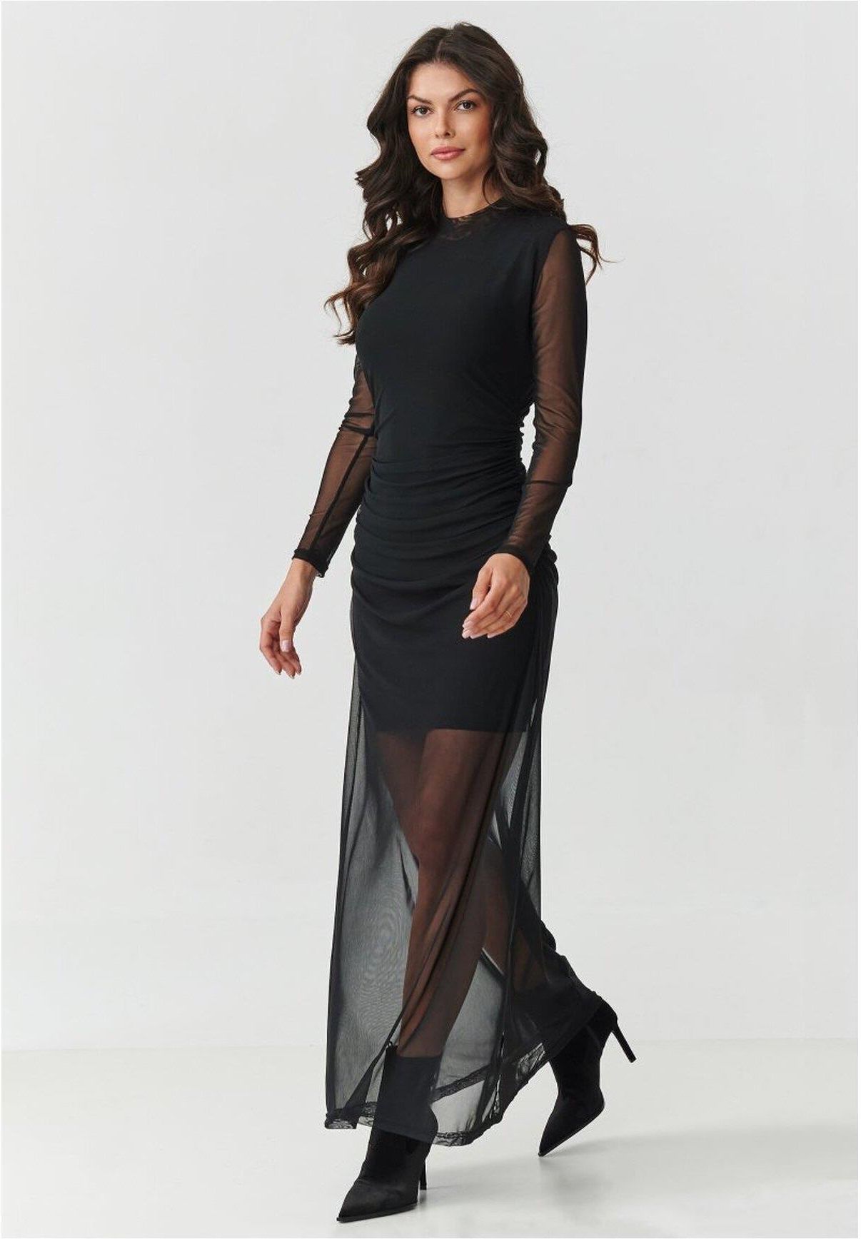 Ta czarna sukienka maxi to kwintesencja nowoczesnej kobiecości i ponadczasowego stylu. Dopasowany krój pięknie podkreśla figurę, a delikatny tiul dodaje lekkości i subtelnego wdzięku. Przezroczyste rękawy oraz półtransparentny dół tworzą niezwykle zmysłowy efekt, dzięki któremu każda stylizacja nabiera wyjątkowego charakteru. Sukienka idealnie sprawdzi się na wyjątkowe okazje – kolację, imprezę, randkę czy wieczorne wyjście. W połączeniu z eleganckimi szpilkami lub botkami tworzy stylowy, kobiecy look, który zachwyci w każdej sytuacji. Jeśli szukasz czarnej sukienki, która łączy w sobie klasę, wygodę i efekt “wow” – ten model będzie strzałem w dziesiątkę. Występuje w kolorze czarnym – uniwersalnym, ponadczasowym i niezwykle szykownym.