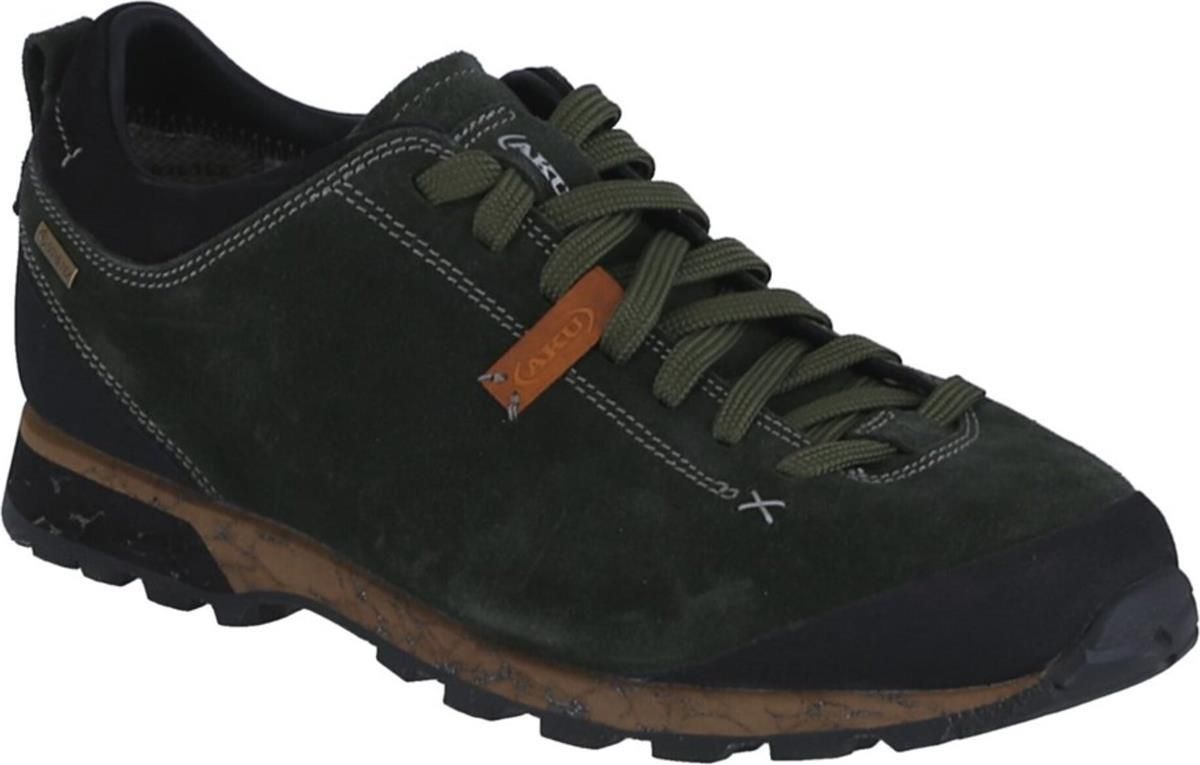 Aku buty trekkingowe męskie Bellamont Gore-tex wytrzymałe turystyczne zielone Eko-projekt – wykorzystanie materiałów pochodzących z recyklingu (m.in. sznurówki, podeszwa, wkładka). Obuwie zostało wyprodukowano w Rumunii. Buty Aku Bellamont 3 to połączenie nowoczesnego stylu miejskiego z niezawodnością obuwia outdoorowego. Stworzone z myślą o osobach, które cenią sobie komfort, trwałość i włoski design, doskonale sprawdzą się zarówno w codziennym użytkowaniu, jak i podczas lekkich wędrówek w terenie. Trekkingowe buty marki Aku. Zastosowane technologie: Buty wyposażone zostały w technologię Gore-tex, zapewnia potrójną ochronę przed warunkami atmosferycznymi, dzięki konkretnym parametrom: wodoszczelności, wiatroszczelności i oddychalności. Podeszwa Vibram Predator II która cechuje się świetną przyczepnością zarówno na mokrych, jak i suchych nawierzchniach. Palce i pieta zabezpieczone poliuretanowym wzmocnieniem z innowacyjnego materiału Liba Smart. Internal Midsole System - podeszwa środkowa wykonana z mikroporowatego materiału zapewnia prawidłowe ułożenie stopy oraz poprawia amortyzację buta. RELAXED FT - konstrukcja butów gwarantująca dopasowanie do stopy oraz wygodę podczas użytkowani.