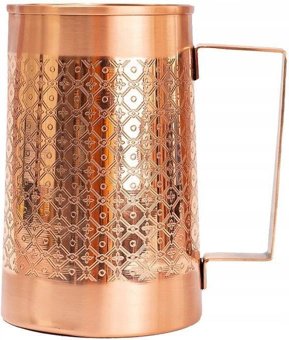 Dzbanek miedziany na wodę, Mosaic, 1500 ml, Forrest and Love Ilość w opakowaniu zbiorczym: 16 Dzbanek miedziany na wodę, Mosaic, 1500 ml, Forrest and Love Dzbanek miedziany na wodę, Mosaic, 1500 ml, Forrest and Love Ponadczasowe i pełne wdzięku nasze miedziane dzbanki są spektakularnym dodatkiem do dobrze nakrytego stołu w jadalni. Każdy element jest starannie wykonany ręcznie, przy zachowaniu technik grawerowania i młotkowania marki. Sylwetki dzbanków wyraźnie stawiają na pierwszym planie funkcjonalność i design oraz reprezentują zamiłowanie Forrest & Love do tradycyjnego designu. Zanurz się w witalnych korzyściach płynących z picia miedzianej wody i pozwól, aby miedziany dzbanek z łatwością ozdobił Twój wystrój eleganckim bukietem kwiatów. Dodaj odrobinę blasku swoim nieformalnym lunchom i kameralnym kolacjom, które pozostawią niezatarte wrażenie! Kolekcja Mosaic to jeden z naszych najdelikatniejszych projektów. Charakteryzuje się drobnym, szczegółowym grawerem. Fryz o symetrycznych krawędziach wraz z misterną kratą czynią go wzorowym okazem finezji. Dzbanek ma wyraźnie królewski wygląd, dodaje bogactwa nakryciu stołu. Przechowuj wodę przez noc i ciesz się wodą wzbogaconą w miedź przez cały dzień. Dzbanek pokryty jest lakierem dopuszczonym do kontaktu z żywnością, co zapewnia błyszczące wykończenie na zewnątrz, natomiast wewnątrz pozostaje nieobrobiony, dzięki czemu czyste jony miedzi mogą przenikać do przechowywanej wody. Nadaje się tylko do wody niegazowanej! Wykonane w 99,7% z miedzi przeznaczonej do kontaktu z żywnością Waga: 425 g Wysokość dzbanka 18,5 cm, średnica 12 cm Zewnętrzna warstwa lakierowana zapewniająca błyszczące wykończenie i łatwą konserwację W 100% wolne od metali ciężkich i toksyn Szeroki otwór do napełniania lodem i łatwego czyszczenia Pojedyncza ściana Korzyści Ajurwedy: Od czasów starożytnych Ajurweda opowiadała się za korzyściami płynącymi z picia wody miedzianej. Według Ajurwedy, jeśli przechowujesz wodę w miedzianym naczyniu przez 4-12 godzin (najlepiej przez noc), woda staje się naturalnie zasadowa. Dzieje się tak, ponieważ miedziane naczynie dodatnio ładuje wodę i energetyzuje ją, dzięki czemu woda znów „ożywa”. Pozostawia również jedwabiście gładki smak. Naładowana woda miedziana pomaga przywrócić równowagę Tridoshy (Vata, Kapha i Pitta) ciała. W Ajurwedzie ta przemieniona, lecznicza woda pobierana z miedzianych naczyń nazywana jest „Tamra Jal”. Korzyści naukowe: Badania pokazują, że naczynia miedziane mogą zwiększać poziom pH wody, a tym samym jej zasadowość. Miedź działa antybakteryjnie i posiada właściwości samosterylizujące. Współczesna nauka nazywa to efektem oligodynamicznym – z natury toksycznym wpływem niektórych metali na patogeny. Wskazówki dotyczące użycia wody i innych napojów: Przechowywanie wody w naczyniach miedzianych przez 4-12 godzin powoduje, że woda staje się naturalnie zasadowa. Aby cieszyć się maksymalnymi korzyściami, pozwól wodzie pozostać w naczyniu przez noc i wypij ją następnego dnia, rano na czczo lub w ciągu dnia, aby uzyskać niezbędną dawkę miedzi dla lepszego życia i nastroju! W miedzianym naczyniu możesz przechowywać dowolny rodzaj wody niegazowanej – wodę filtrowaną, wodę butelkowaną i wodę z kranu. W jednowarstwowych miedzianych naczyniach zalecamy przechowywanie wyłącznie wody niegazowanej. Z produktami miedzianymi nie należy stosować wody gazowanej, napojów kwaśnych ani żadnych dodatków, takich jak plasterki cytryny, liście mięty itp. Miedź, podobnie jak każdy inny metal szlachetny, może reagować z płynami kwaśnymi (wszystkimi, których pH jest mniejsze niż 7) lub płynami na bazie mleka. Jeśli chcesz nadać swojej wodzie smak, możesz dodać dodatki do szklanki po nalaniu do niej wody z miedzianej butelki, dzbanka lub kubka. Miedź reaguje negatywnie z zawartością kwasu w napojach takich jak herbata czy kawa. Poza tym miedź jest miękkim, przewodzącym metalem, który może bardzo szybko się nagrzewać i prowadzić do deformacji. Dlatego do naszych miedzianych naczyń można używać wyłącznie wody niegazowanej; najlepiej w temperaturze pokojowej. W przypadku gorącej wody należy upewnić się, że woda nie jest wrząca. Wskazówki dotyczące czyszczenia: Użytkownicy, którzy korzystają z nich po raz pierwszy, często boją się najmniejszej plamy lub przebarwienia na miedzianych naczyniach. Jednak nie martwcie się, wnętrza naszych naczyń na wodę, których używamy od dziesięcioleci pociemniały. Mimo to codziennie delektujemy się rewitalizującą wodą nasyconą miedzią! Tego typu miedziane garnki i naczynia są codziennością w większości kuchni indyjskich, cenionych ze względu na bogatą tradycję. Miedź nie rdzewieje; zamiast tego naturalnie się utlenia, powodując przebarwienia lub ciemne plamy. To utlenianie, zwane patyną, jest zjawiskiem całkowicie naturalnym i nie można go uniknąć. Prowadzi nas to do kluczowego i często zadawanego pytania: Jak zachować nieskazitelny wygląd miedzianej butelki i jak często należy ją czyścić? Dbanie o wnętrze Aby wyczyścić naczynie, wsyp do niego 1-2 łyżki kwasku cytrynowego, zalej gorącą wodą i odstaw na maksymalnie 2-3 minuty. Należy zachować ostrożność, aby nie pozostawiać mieszaniny na dłużej, ponieważ długotrwałe narażenie na działanie kwasu może mieć szkodliwy wpływ na miedź. Następnie wstrząśnij, opłucz i dokładnie wysusz naczynie przed dalszym użyciem. To prosty proces! Należy zachować ostrożność podczas obchodzenia się z miedzią, ponieważ może szybko się nagrzać. Zalecane jest noszenie środków ochrony rąk. Jak często czyścić? Biorąc pod uwagę, że miedź ma naturalne właściwości antybakteryjne i samosterylizujące, przedmioty miedziane nie wymagają częstego czyszczenia. Czyszczenie raz na dwa tygo
