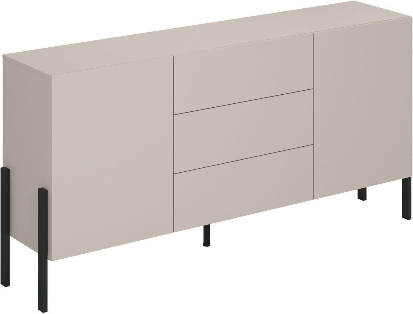 Komoda JUKON na nóżkach to propozycja dla osób, które cenią nowoczesną estetykę połączoną z praktycznymi rozwiązaniami do codziennego użytku. Stonowany kolor kaszmir pięknie wpisuje się w aktualne trendy, nadając wnętrzu wrażenie harmonii i wizualnej lekkości. Smukłe, czarne nóżki nadają meblowi charakter loftowy, jednocześnie podkreślając jego elegancki, minimalistyczny styl. To idealna komoda do salonu, sypialni lub jadalni, która doskonale sprawdzi się zarówno w małych, jak i większych pomieszczeniach. Trzy pojemne szuflady i dwie szafki – perfekcyjny porządek na co dzień Wnętrze komody zostało zaprojektowane tak, aby ułatwić przechowywanie różnorodnych przedmiotów. Centralnie umieszczone trzy szerokie szuflady świetnie nadają się na tekstylia, dokumenty czy drobiazgi, które warto mieć zawsze pod ręką. Po bokach znajdują się dwie zamykane szafki z półkami, dzięki którym zyskasz dodatkową przestrzeń na rzadziej używane akcesoria, naczynia lub domowe wyposażenie. Taki układ czyni mebel niezwykle uniwersalnym i sprawia, że świetnie wpisuje się w potrzeby nowoczesnego domu. Stabilna konstrukcja i komfort użytkowania Komoda opiera się na solidnych, metalowych nóżkach, zapewniających stabilność i ułatwiających utrzymanie czystości pod meblem. Gładkie fronty bez zbędnych zdobień podkreślają nowoczesny charakter bryły, a trwałe materiały gwarantują długotrwałe, wygodne użytkowanie. To komoda na nóżkach, która nie tylko świetnie wygląda, ale również zapewnia praktyczne miejsce do przechowywania, pomagając zachować ład i estetykę we wnętrzu. Wymiary Szerokość: 184 cm Głębokość: 40 cm Wysokość: 90 cm