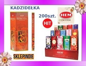 KADZIDEŁKA EROTIC EROTYCZNE HIT 200szt. Opakowanie hurtowe 25 pudełeczek po 8szt. razem 200szt. PRODUCENT Erotic jeden z ładniejszych indyjskich zapachów - wspaniała aromatyczna, zmysłowa mieszanka olejków eterycznych i ziół z nutą erotycznego zabarwienia. Kadzidełka HEM są wykonane z najlepszych naturalnych składników - płatków, żywicy itp. - ręcznie rolowane i pakowane. Uznawane za jedne z najlepszych dzięki zastosowaniu w produkcji naturalnych składników i tradycyjnych receptur. Każde kadzidełko posiada dużą objętość i długość 24cm co zapewnia długi czas palenia ok. 40 minut i tym samym ulubiony zapach na długo pozostaje w danym miejscu. Kadzidełka są używane od 1000 lat na całym świecie a głównie w krajach arabskich i dalekim wschodzie Indiach i Chinach. Wbrew obiegowym opiniom stosowanie kadzidełek ma właściwości lecznicze oraz relaksujące. Pozytywnie wpływają na psychikę, odprężają i relaksują. Bardzo ważne jest odpowiednie używanie kadzidełek w małych pomieszczeniach należy spalać po pół pałeczki (gasząc kadzidełka np. w piasku czy ziemi aby móc je znowu użyć) tak aby zapach odpowiednio wymieszał się z powietrzem w danym pomieszczeniu.Polecamy wszystkim kadzidełka Hem są sprawdzone od ponad 10 lat i najlepsze w stosunku jakość + cena.Kadzidełka HEM sprzedawane na tej aukcji są w 100% oryginalne. Posiadają zabezpieczenia w postaci loga HEM oraz znaki firmowe na kartonikach w miejscu otwarcia. Tylko tak zabezpieczone kadzidełka dają pewność oryginału, który jest do nabycia na tej aukcji. IMPORT INDIEW SPRZEDAŻY POSIADAMY WSZYSTKIE ZAPACHY KADZIDEŁEK, SKRZYNKI NA KADZIDŁA I OLEJKI NATURALNE.