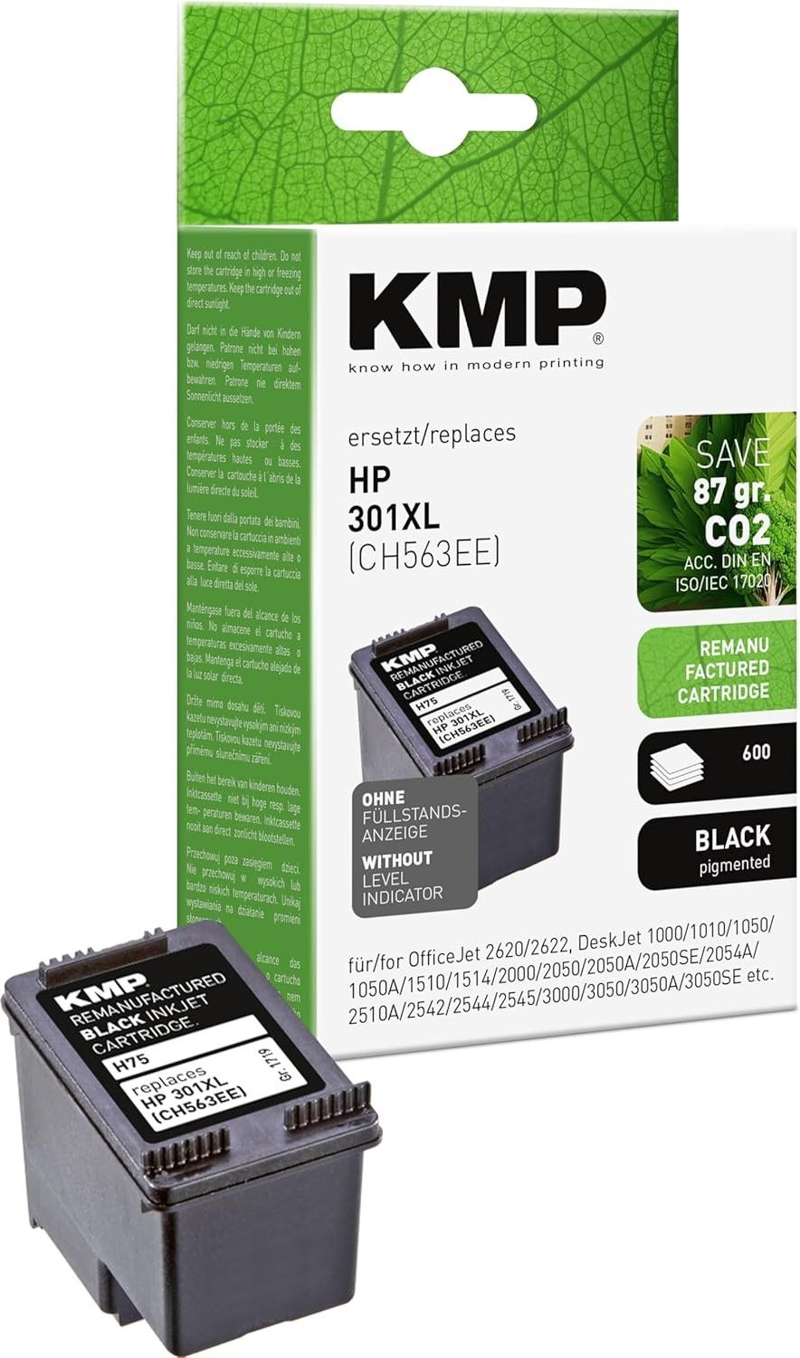 W zestawie otrzymujesz 1x Tusz do HP 301XL BK (15 ml) CZARNY Tusz premium KMP oparty na oryginalnej bazie od HP gwarantuje maksymalną wydajność i bezpieczeństwo druku. Tusz w 100% wyprodukowany w Europie z dożywotnią gwarancją. Dedykowany atrament i precyzyjna głowica zapewniają najwyższą jakość druku, a specjalny klip chroni przed zaschnięciem i rozlaniem, zapewniając 100% bezpieczeństwa głowicy nawet po wielu miesiącach. Parametry Marka: KMP Model: 301XL BK do drukarki HP Kolor: czarny (black) Pojemność: 15 ml Stan: Nowy, gotowy do natychmiastowej instalacji Gwarancja: Dożywotnia Dlaczego warto wybrać markę KMP? W 100% europejska produkcja: Dedykowany atrament sprawia, że wydruk charakteryzuje się ostrym tekstem i głębokim nasyceniem. Realna oszczędność pieniędzy: Technologia wykorzystania OEM (oryginalnej obudowy producenta drukarki) znacząco obniża koszty przy zachowaniu najwyższych parametrów. Bezpieczeństwo i Gwarancja: Produkt objęty jest ochroną aż do całkowitego wyczerpania – gwarantujemy bezproblemową wymianę lub zwrot. Certyfikat CO2: Wybierając ten tusz, redukujesz emisję CO2, co potwierdza oficjalny certyfikat środowiskowy. Tusz w 100% kompatybilny z drukarkami HP Officejet 2620 HP Officejet 2622 HP Deskjet 1000 HP Deskjet 1010 HP Deskjet 1050 HP Deskjet 1050A HP Deskjet 1510 HP Deskjet 1514 HP Deskjet 2000 HP Deskjet 2050 HP Deskjet 2050A HP Deskjet 2050SE HP Deskjet 2054A HP Deskjet 2510A HP Deskjet 2542 HP Deskjet 2544 HP Deskjet 2545 HP Deskjet 3000 HP Deskjet 3050 HP Deskjet 3050A HP Deskjet 3050SE HP Deskjet 3050VE HP Deskjet 3052A HP Deskjet 3054A HP Deskjet 3055A HP Deskjet 3059A HP Envy 4500AIO HP Envy 5530 Series