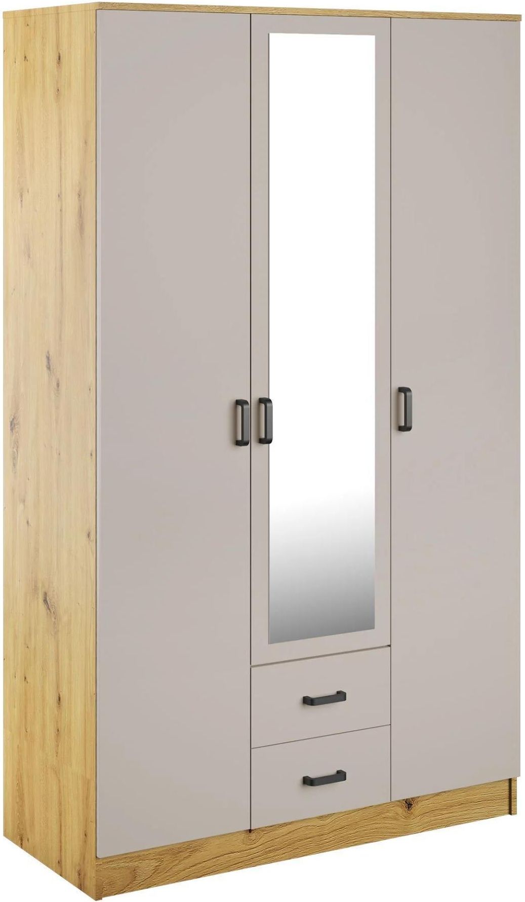 Szafa Cento II 120x200 3D2S dąb artisan / kaszmir z lustrem to wyważone połączenie przytulnej kolorystyki i praktycznych rozwiązań, idealne do wnętrz inspirowanych stylem klasycznym, japandi, boho, skandynawskim lub nowoczesnym. Fronty w odcieniu kaszmiru prezentują się subtelnie i elegancko, kontrastując z ciepłą strukturą korpusu w dekorze dąb artisan, który dodaje meblowi naturalnego charakteru. Centralnie umieszczone lustro rozjaśnia przestrzeń i czyni ją bardziej przestronną, jednocześnie spełniając codzienne potrzeby użytkowników. Praktyczny układ wnętrza zawiera aż sześć półek zamykanych, dwa drążki na wieszaki oraz dwie pojemne szuflady umieszczone na prowadnicach rolkowych. Uchwyty z tworzywa sztucznego w ciemnym kolorze harmonizują z całością i zapewniają wygodne użytkowanie. Szafa nie posiada funkcji pełnego wysuwu ani cichego domyku. Wymiary mebla wynoszą 120 cm szerokości, 205 cm wysokości i 52 cm głębokości. Korpus i fronty wykonano z płyty laminowanej o grubości 16 mm, a całość przeznaczona jest do samodzielnego montażu. To doskonały wybór do sypialni, przedpokoju lub garderoby.