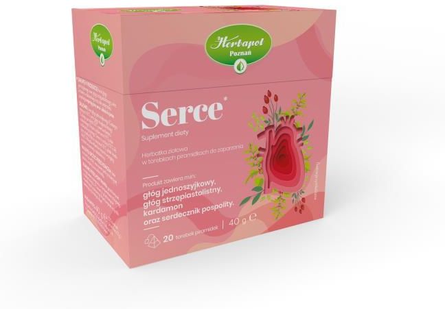 Opis Serce* Suplement diety *Zawarte w produkcie: kwiat głogu jednoszyjkowego, owoc głogu strzępiastolistnego, owoc kardamonu malabarskiego oraz ziele serdecznika pospolitego wspierają pracę serca i układu krążenia. Suplement diety nie może być stosowany jako substytut (zamiennik) zróżnicowanej diety. Prowadzenie zdrowego trybu życia i stosowanie zrównoważonej diety są niezbędne dla zachowania dobrego stanu zdrowia. Wszystkie składniki mieszanki występują w postaci wysuszonej i rozdrobnionej. Cechy produkt zawiera m.in.: głóg jednoszyjkowy, głóg strzępiastolistny, kardamon oraz serdecznik pospolity Składniki kwiat głogu jednoszyjkowego (Crataegus monogyna) 40 %, owoc głogu strzępiastolistnego (Crataegus pinnatifida) 28 %, owoc kardamonu malabarskiego (Elettaria cardamomum) 11 %, ziele serdecznika pospolitego (Leonurus cardiaca) 10 %, liść jeżyny słodkiej (Rubus suavissimus) 10 %, płatki kwiatu róży 1 % Wartości odżywczeZawartość poszczególnych składników w przeliczeniu na zalecaną do spożycia dzienną porcję produktu (1 torebka) wynosi odpowiednio: Wartość odżywcza produktu w 100 ml naparu herbatki Wartość odżywcza produktu 1 porcja produktu 200 ml (napar z 1 torebki po 2 g) kwiat głogu jednoszyjkowego 0,8 g owoc głogu strzępiastolistnego 0,56 g owoc kardamonu malabarskiego 0,22 g ziele serdecznika pospolitego 0,2 g liść jeżyny słodkiej 0,2 g płatki kwiatu róży 0,02 g Wartość energetyczna 9 kJ / 2 kcal 18 kJ / 4 kcal Białko Zawiera znikome ilości tłuszzu (w tym kwasów tłuszczowych nasyconych), węglowodanów (w tym cukrów) i soli. Opakowanie zawiera 20 dziennych porcji. Stosowanie Zalecane dzienne spożycie: zaleca się spożywanie naparu przygotowanego każdorazowo z jednej torebki 1 raz dziennie. Jedna torebka przeznaczona jest do przygotowania jednej szklanki naparu. Nie należy przekraczać zalecanej porcji do spożycia w ciągu dnia. Sposób przygotowania: jedną torebkę zalać 200 ml świeżo zagotowanej wody. Zaparzać pod przykryciem 8-10 minut. Przechowywanie Najlepiej spożyć przed końcem: data minimalnej trwałości oraz numer partii produkcyjnej podane na tylnej ściance kartonika. Przechowywać w oryginalnym opakowaniu, w temperaturze pokojowej, w suchym miejscu. Po otwarciu przechowywać w zamkniętym opakowaniu. Przeciwwskazania Produkt przeznaczony jest dla osób dorosłych. Osoby przyjmujące leki nasercowe, przed zastosowaniem produktu, powinny skonsultować się z lekarzem. Nie zaleca się stosowania produktu u kobiet w ciąży oraz karmiących piersią. Nie stosować w przypadku uczulenia na którykolwiek ze składników suplementu diety. Przechowywać w sposób niedostępny dla małych dzieci. Producent Poznańskie Zakłady Zielarskie Herbapol S.A. Ważne Masa netto: 40 g e (20 torebek piramidek x 2 g) Zawartość opakowania 40