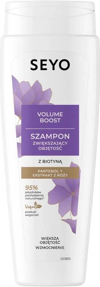 Seyo szampon do włosów zwiększający objętość z biotynąSzampon Volume Boost skutecznie oczyszcza skórę głowy oraz włosy, usuwając z nich wszelkie zanieczyszczenia. Wzbogacony o biotynę, pantenol i ekstrakt z róży zwiększa objętość włosów, uelastycznia je i nadaje im połysk. Po zastosowaniu włosy są optycznie gęstsze, grubsze oraz mniej podatne na uszkodzenia i łamanie.Produkt nie obciąża włosów, ułatwia ich rozczesywanie oraz zapobiega elektryzowaniu się. Idealny do codziennej pielęgnacji. Jak używaćSzampon nanieść na wilgotne włosy, spienić, dokładnie spłukać. W razie konieczności czynność powtórzyć. Następnie na umyte, wilgotne włosy nałożyć odżywkę, po minucie obficie spłukać. Skuteczność potwierdzona badaniami aplikacyjnymi przy jednoczesnym stosowaniu szamponu i odżywki SEYO Volume Boost.Środki ostrożności Unikać kontaktu z oczami. W razie kontaktu z oczami natychmiast przepłukać je wodą.