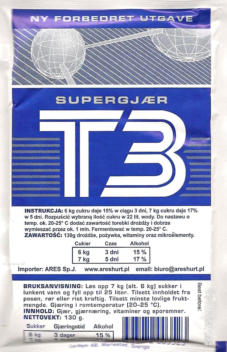 Oznaczenie seria T oznacza TURBO. Drożdże serii T - T3, T48, TVodka Star - to produkty o najlepszym stosunku ceny do jakości. Wyprodukowane w Szwecji, aby sprostać wysokim oczekiwaniom naszych Klientów. Drożdże serii T - T3, T48, TVodka Star - to produkty o najlepszym stosunku ceny do jakości. Wyprodukowane w Szwecji, aby sprostać wysokim oczekiwaniom naszych Klientów. Drożdże gorzelnicze T3 Składniki: 130 g netto, C drożdże pożywka, witaminy i mikroelementy. Sposób użycia : 6 kg cukru daje 15% w 3 dni, 7 kg daje 17% w 5 dni. Wybraną ilość cukru rozpuścić w 25 litrach wody. Zawartość saszetki dodać do nastawu o temperaturze około 20-25°C i dobrze wymieszać przez około 1 minutę. Fermentować w 20-250°C.