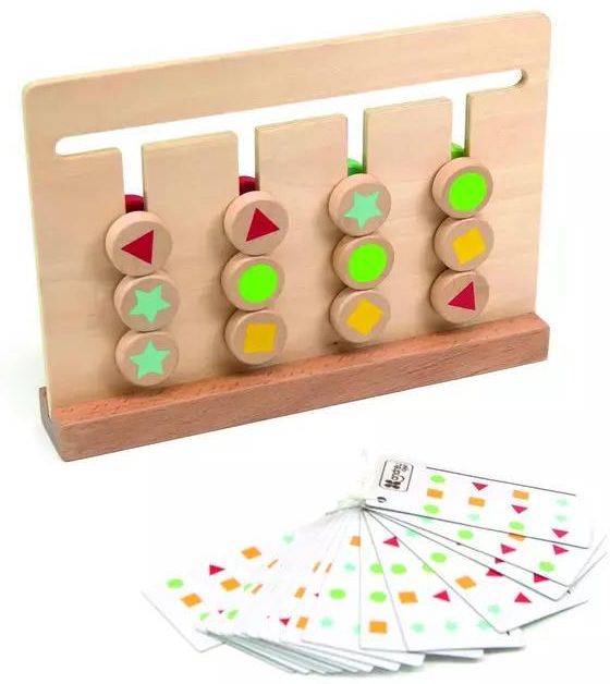 Andreu Toys Pasujące kolory i kształty Dla kogo? Pasujące kolory i kształty dla dzieci 2 lata+ Wczesne rozwijanie funkcji poznawczych pomaga najmłodszym w zdobywaniu podstawowych umiejętności, zaspokajaniu ciekawości oraz rozumieniu świata. Warto sięgać po narzędzia edukacyjne, które w naturalny sposób wspierają ten etap i jednocześnie zapewniają dobrą zabawą. Jednym z nich jest drewniany zestaw Pasujące kolory i kształty. Pasujące kolory i kształty to gra dla jednego lub dwóch uczestników. Zabawa polega na układaniu wzorów zgodnie ze wskazówkami znajdującymi się na szablonach lub według własnego pomysłu. Dzięki takiej aktywności dziecko wspomaga integrację sensoryczną a poprzez to może poznawać świat i wzbogacać swoją wiedzę o nim. Ponadto układanka uczy logicznego myślenia. Mały użytkownik musi wymyślić, jak przesuwać klocki, by odwzorować sekwencję na karcie. Doskonali pamięć operacyjną odpowiedzialną za przetwarzanie wiadomości i przechowywanie ich. W przyszłości lepiej poradzi sobie z organizowaniem wiedzy i wykorzystywaniem jej. Pasujące kolory i kształty to też świetna pomoc w rozwoju motoryki małej i zręczności maluszka. Dzięki ćwiczeniom manipulacyjnym jest sprawniejszy manualnie i lepiej radzi sobie z czynnościami samoobsługowymi. Układanka Pasujące kolory i kształty to doskonały prezent dla dziecka powyżej 2. roku życia. Świetnie sprawdzi się w żłobku, klubie malucha lub kąciku dla najmłodszych w restauracji czy hotelu. Dlaczego warto? Rozwija funkcje poznawcze Zestaw Pasujące kolory i kształty daje możliwość tworzenia dowolnych sekwencji lub odtwarzania ich z kart aktywności. Dziecko ma do wyboru żółty kwadrat, zielone koło, czerwony trójkąt i niebieską gwiazdę. Zabawa w układanie wzorów na drewnianym stelażu pozwala najmłodszym na poznawanie kształtów i barw oraz utrwalanie ich nazw. Tak stymulowane dziecko rozwija wczesne funkcje poznawcze, które wpływają na jego intelekt oraz zaspokajają naturalną ciekawość i uczą logicznego myślenia. Wspomaga rozwój motoryki małej i koordynacji wzrokowo-ruchowej Zadanie gracza polega na odwzorowywaniu sekwencji z szablonu Pasujących kolorów i kształtów lub układanie ich według własnego pomysłu. Musi manipulować klockami i przesuwać je po drewnianym stelażu. W trakcie wykonywania tych czynności doskonali prawidłowy chwyt, zręczność, siłę oraz ruchy po łuku. Taka aktywność pomaga w rozwoju motoryki małej oraz koordynacji ręka-oko, która jest niezbędna w nauce czytania i pisania. Sprawne manualnie dziecko potrafi wykonywać precyzyjne czynności, takie jak operowanie nożyczkami czy sztućcami, zapinanie guzików i zawiązywanie sznurowadeł. Stymuluje percepcję wzrokową Używanie zestawu Pasujące kolory i kształty dostarcza wrażeń sensorycznych. Obserwując różnokolorowe klocki i odnajdując konkretne barwy Twoja pociecha stymuluje percepcję wzrokową. Dziecko może segregować klocki, przeliczać je, kategoryzować, tworzyć z nich wzory i sekwencje. Taka zabawa usprawnia ruch gałek ocznych i doskonali spostrzegawczość. Integracja sensoryczna jest niezwykle istotna w prawidłowym funkcjonowaniu najmłodszych. Prawidłowo odbierane bodźce umożliwiają rozumienie świata i pomagają w opanowaniu emocji. Pomysły na zabawę Która to karta – percepcja wzrokowa, koncentracja, koordynacja wzrokowo-ruchowa Gra dla dwóch osób. Rozkładamy karty wybranymi stronami do góry, drewnianą ramę oraz klocki. Jedna osoba układa wybrany wzór bez wskazywania go. Drugi gracz odgaduje, z której karty pochodzi sekwencja. Dokańczanie – logiczne myślenie, spostrzegawczość, motoryka mała Gra dla dwóch osób. Rozkładamy drewnianą ramę oraz klocki. Jedna osoba zaczyna układać wzór według jakiegoś klucza, np. naprzemiennie dwie/trzy figury. Zadanie drugiego gracza polega na jak najszybszym odgadnięciu klucza i dokończenie wzoru. Co zawiera? Zestaw zawiera: układankę oraz 18 dwustronnych kart Główne informacje Wiek: 2 lata+ Wymiary produktu: 26 x 4 x 18,5 cm Wymiary opakowania: 29 x 21,5 x 6 cm Produkt posiada certyfikaty CE, FSC