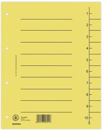 PRZEKŁADKA DONAU, KARTON, A4, 235X300MM, 1-10, 1 KARTA, ŻÓŁTA wykonane z grubego kartonu o gramaturze 250gsm uzyskanego na drodze recyklingu posiada Zielony Punkt (Der Grüne Punkt) - udział w systemie recyklingu i odzysku odpadów wynikający z przepisów prawa polskiego i UE posiada certyfikat Blauer …