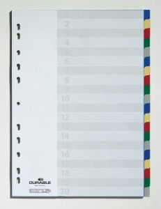 Przekładki Durable format A4 wykonane polipropylenu pionowe, 20 części bez opisu przeznaczone do przechowywania luźnych posegregowanych dokumentów, co daje możliwość szybkiego ich wyszukania nakładka ze spisem treści w zestawie uniwersalny rozstaw dziurek wymiary: wysokość 297 mm, szerokość 210/220 mm kolorowe cena z 1 sztukę